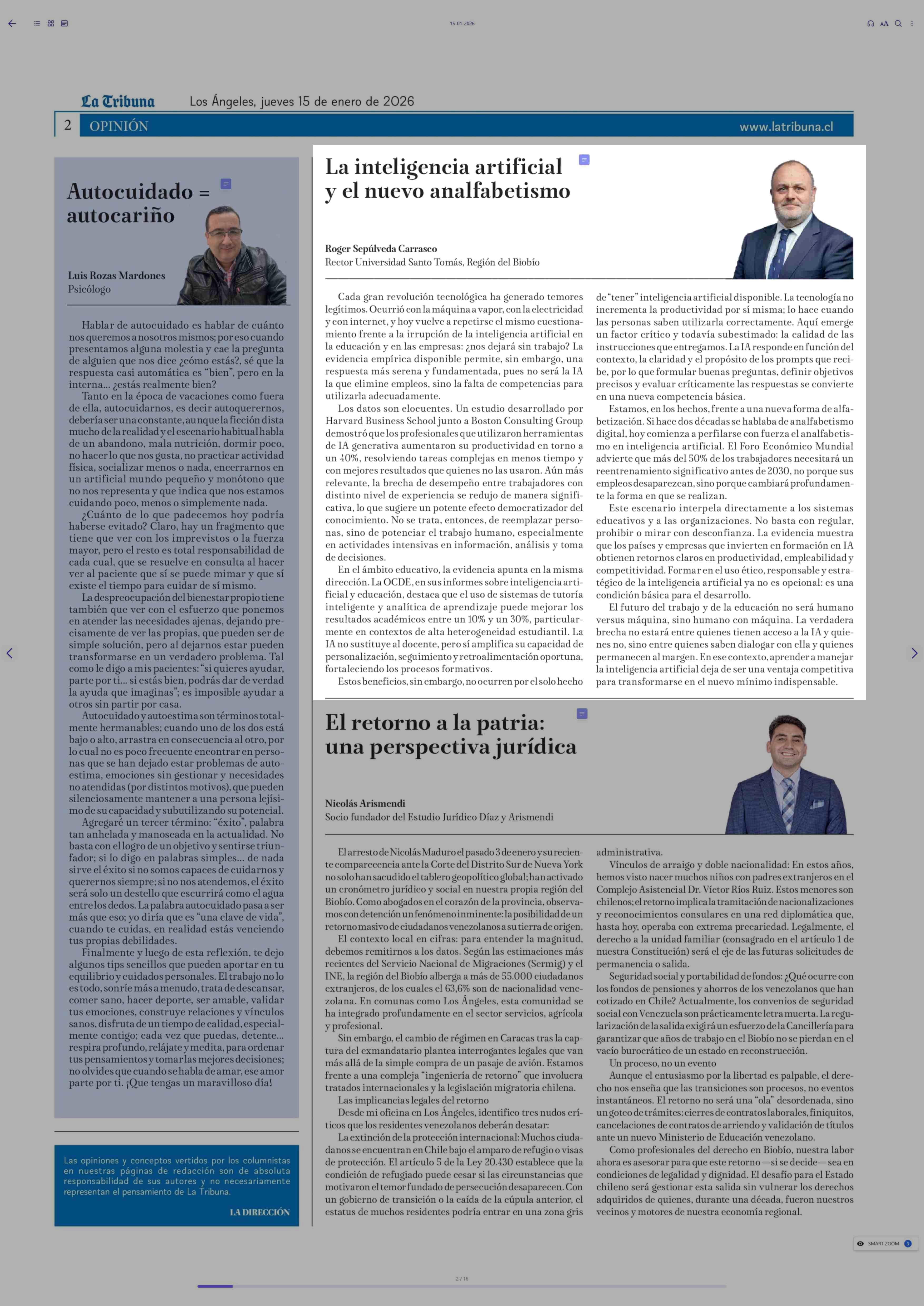 Columnas de Opinión: La inteligencia artificial y el nuevo analfabetismo 15-01-2026 La Tribuna |