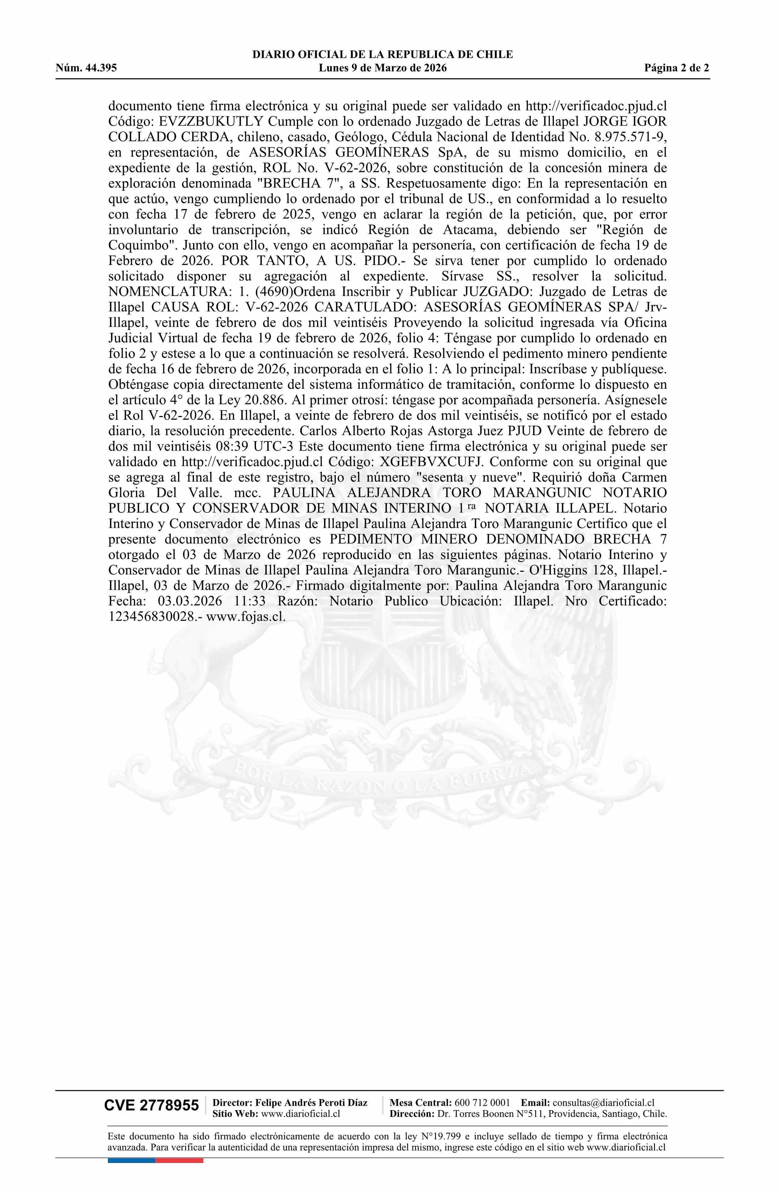 BRECHA 7 / Asesorías Geomineras SpA 09-03-2026 DIARIO OFICIAL CHILE - BOLETÍN OFICIAL DE MINERÍA |