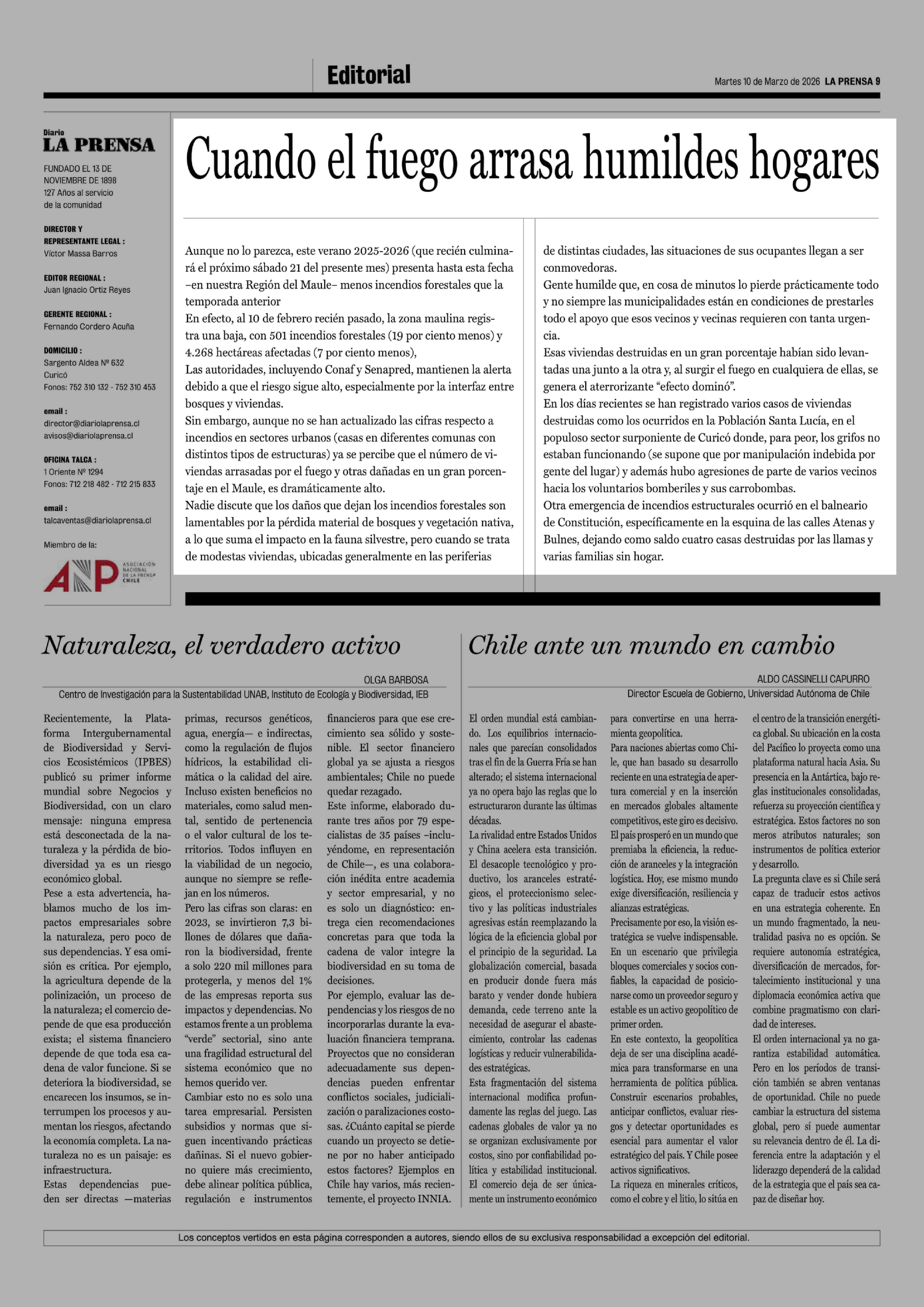 Editorial: Cuando el fuego arrasa humildes hogares 10-03-2026 La Prensa de Curicó |