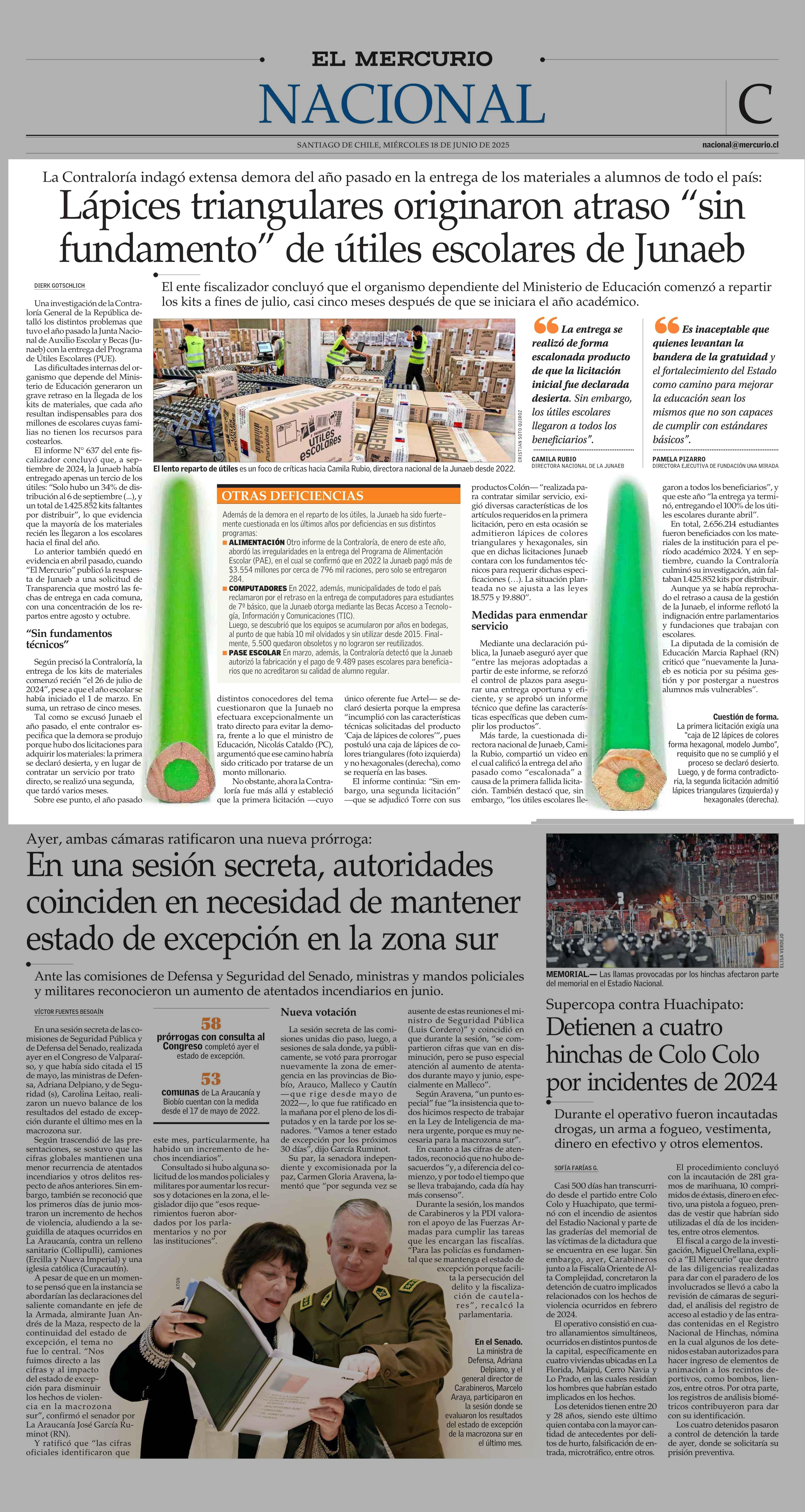 Lápices triangulares originaron atraso “sin fundamento” de útiles escolares de Junaeb 18-06-2025 El Mercurio |