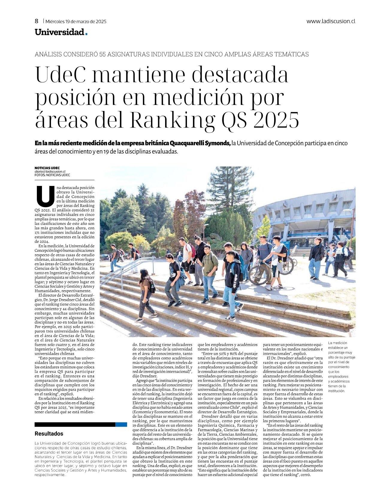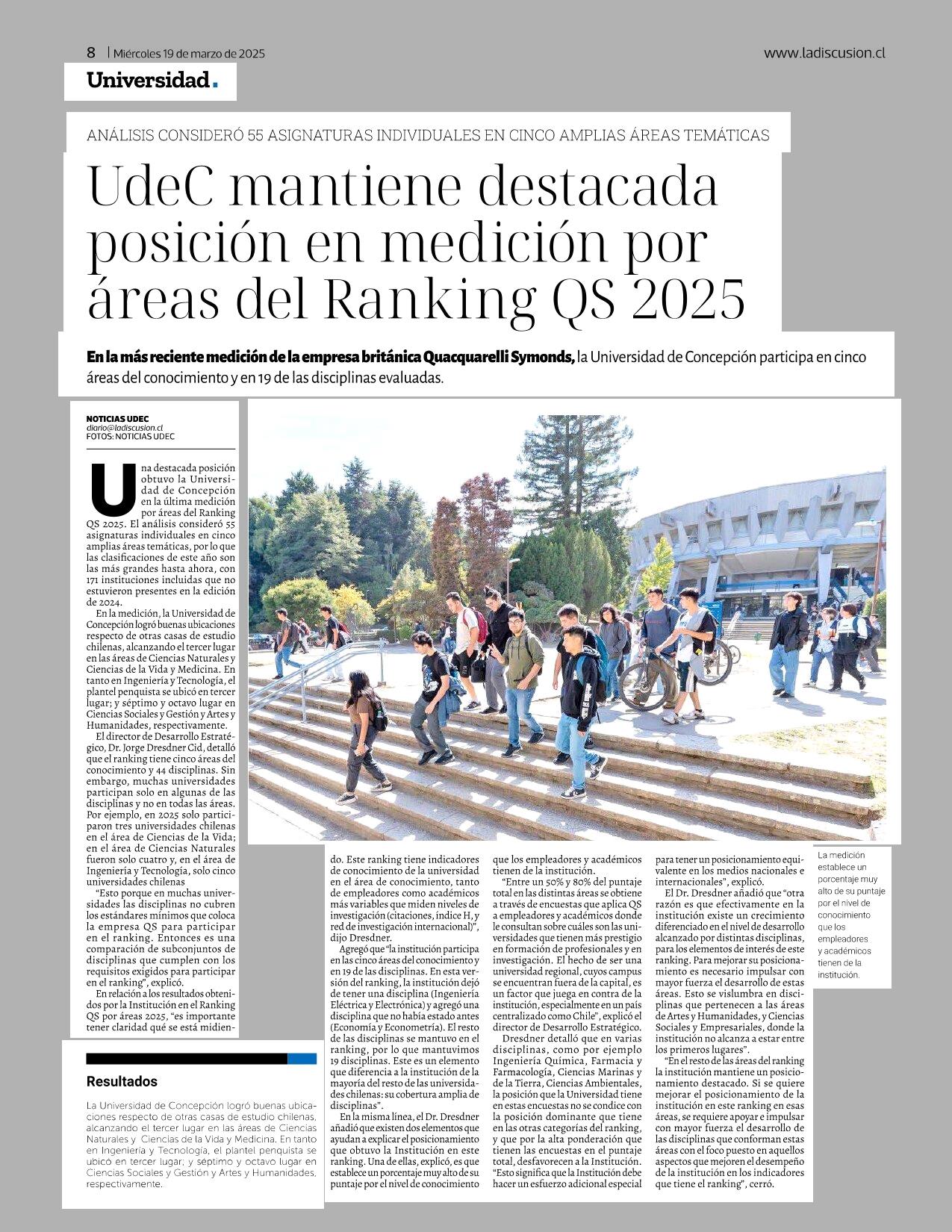 Ude C mantiene destacada posición en medición por áreas del Ranking QS 2025 19-03-2025 La Discusión |