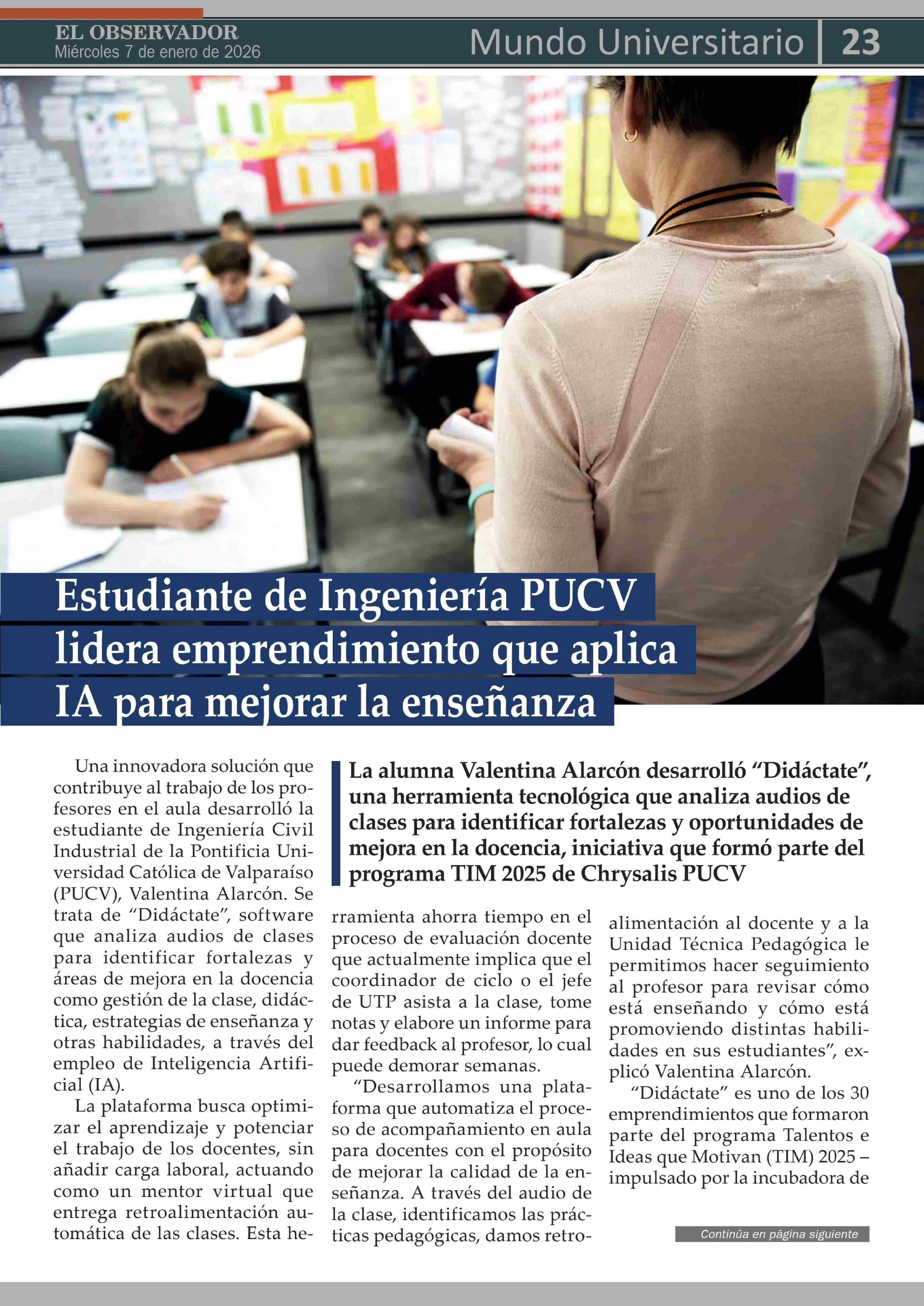 Estudiante de Ingeniería PUCV lidera emprendimiento que aplica IA para mejorar la enseñanza 07-01-2026 El Observador Vespertino |