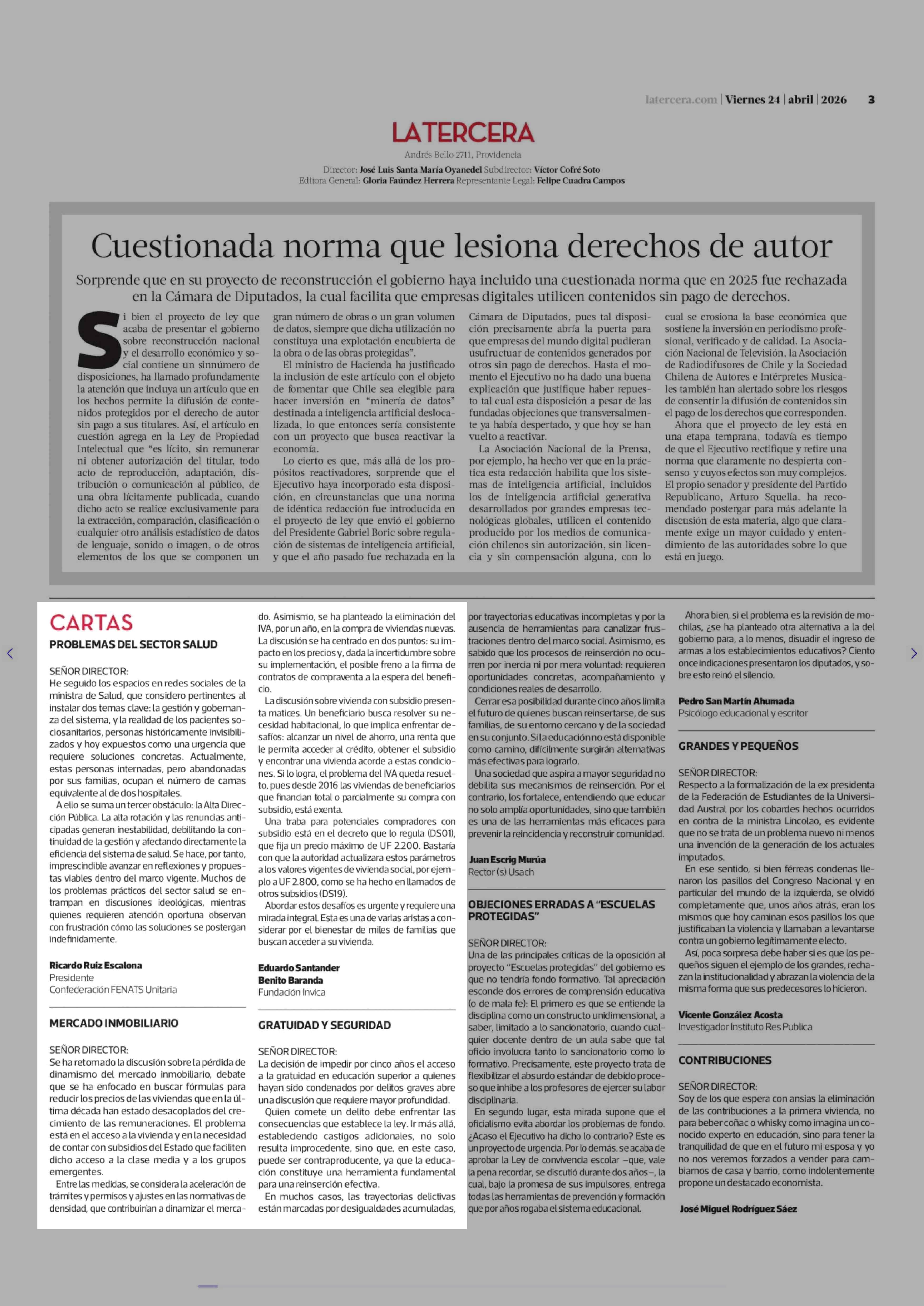 Cartas: MERCADO INMOBILIARIO 24-04-2026 La Tercera |