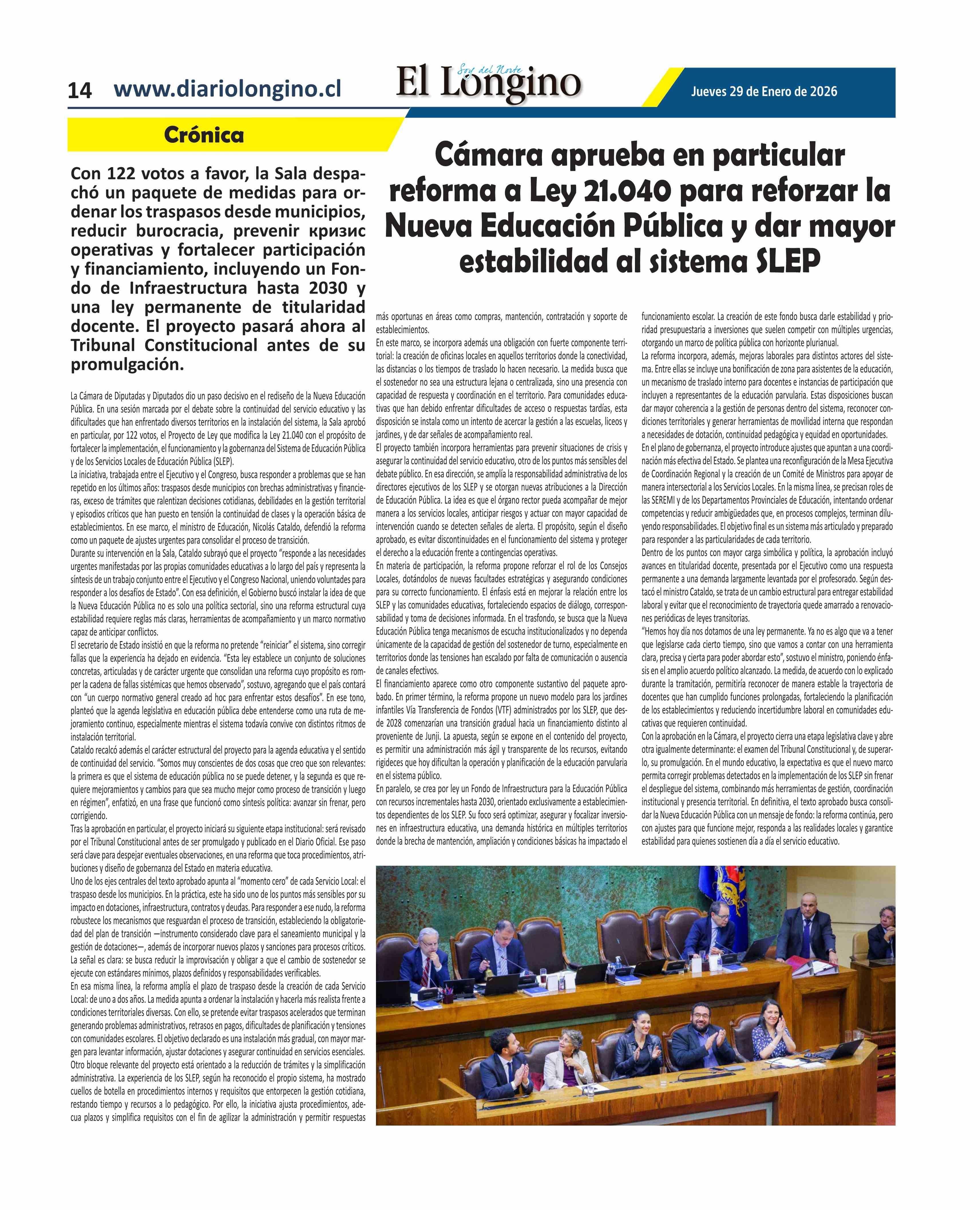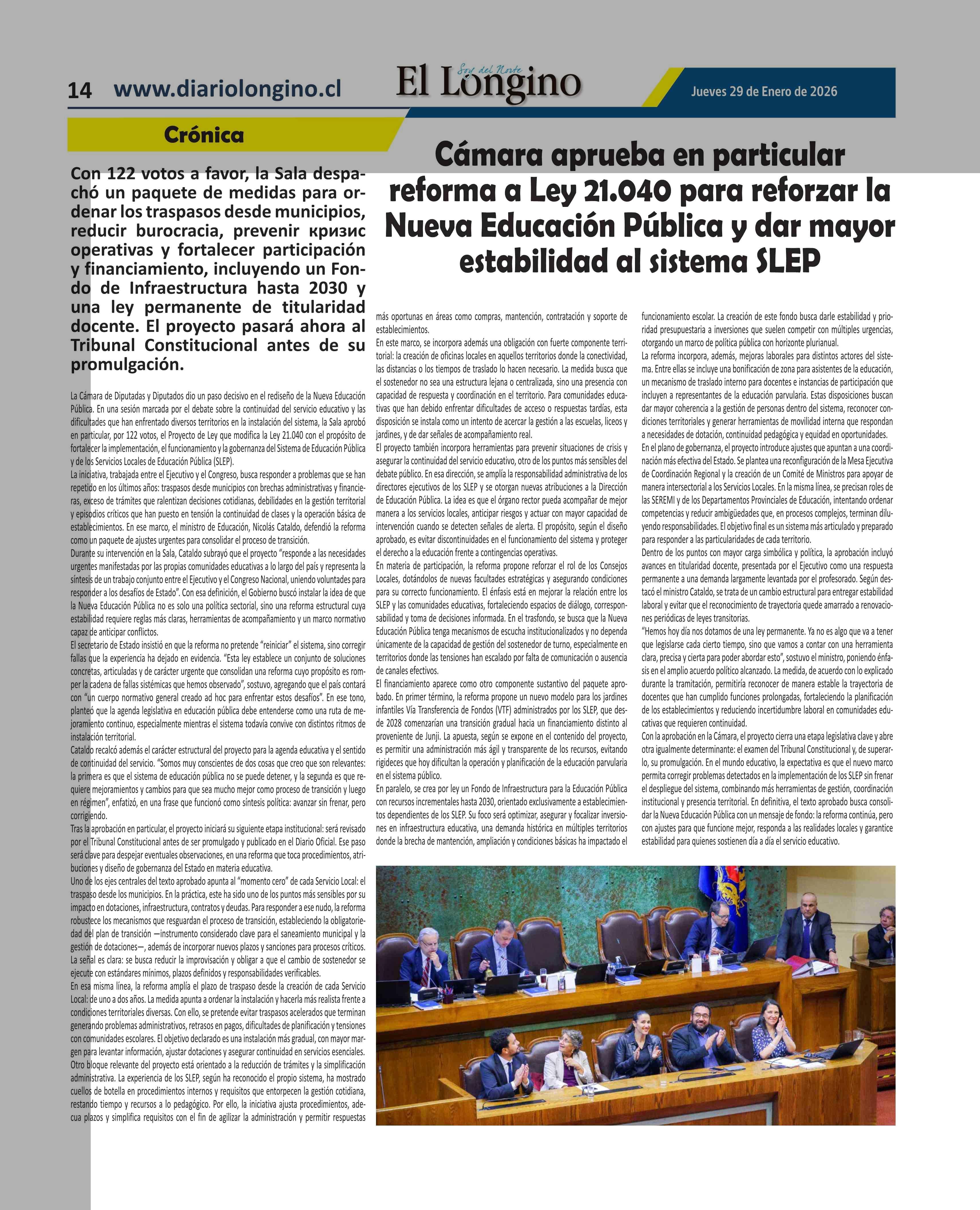 Cámara aprueba en particular reforma a Ley 21.040 para reforzar la Nueva Educación Pública y dar mayor estabilidad al sistema SLEP 29-01-2026 El Longino |