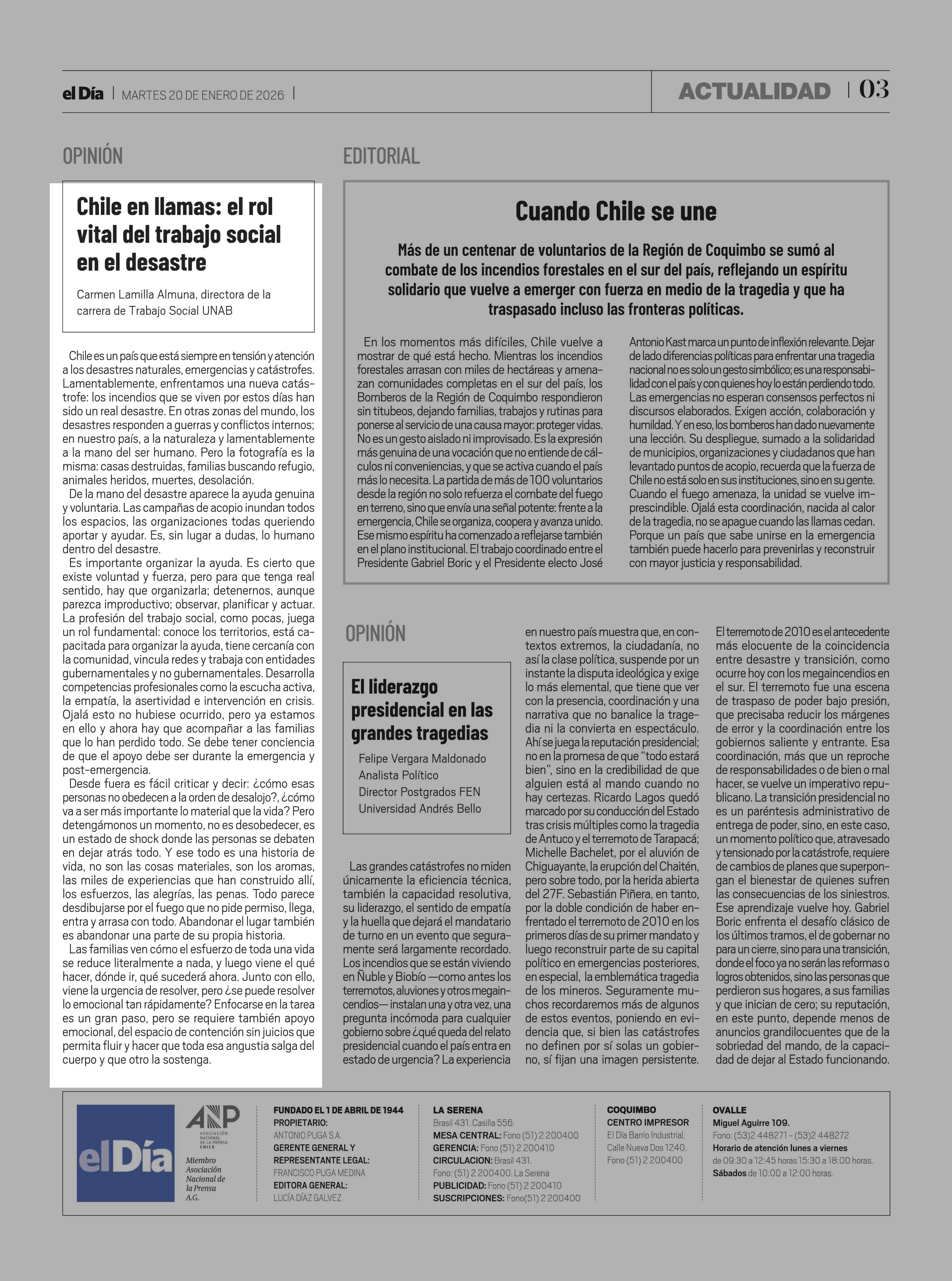 Columnas de Opinión: Chile en llamas: el rol vital del trabajo social en el desastre 20-01-2026 El Día |