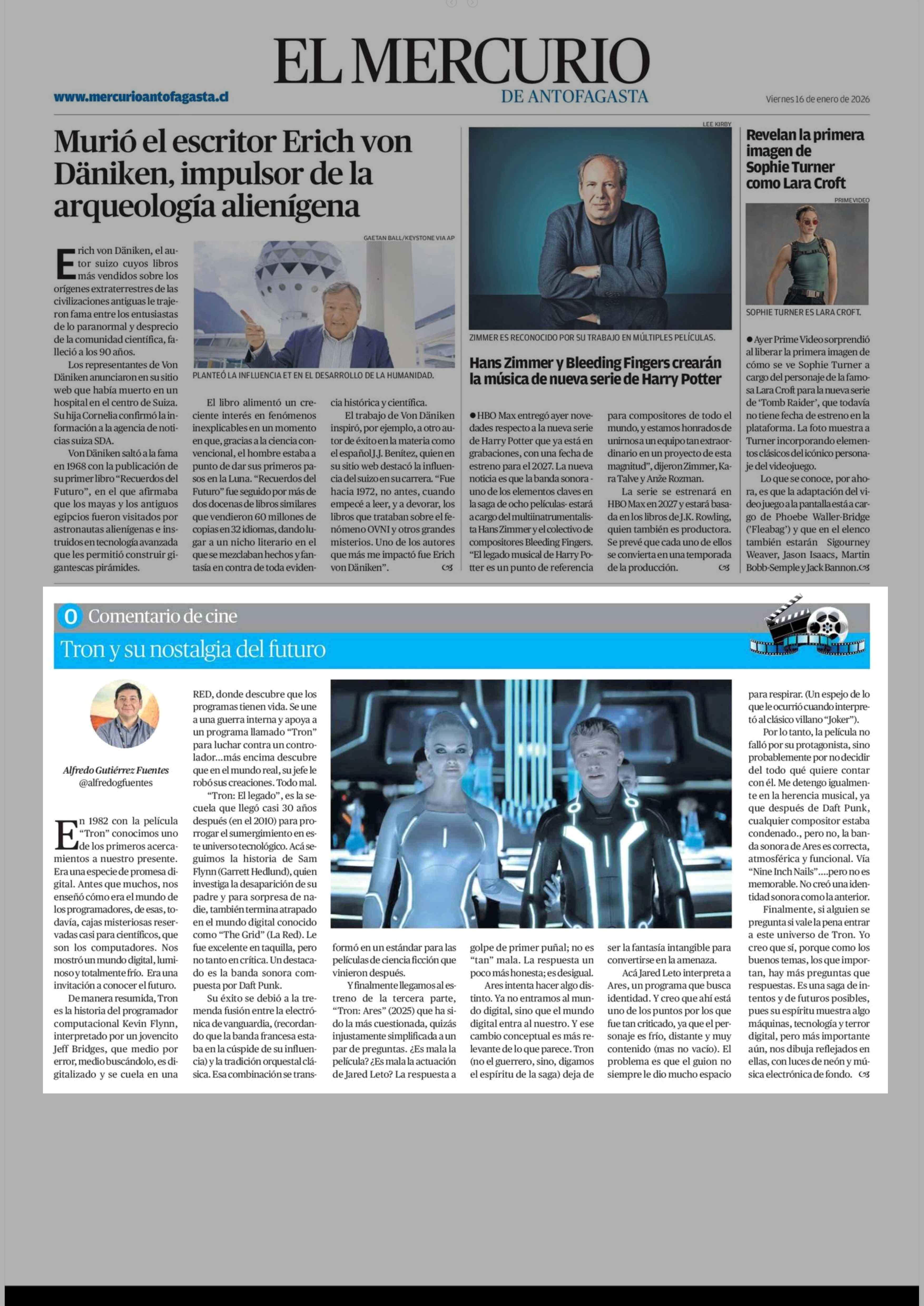 Tron y su nostalgia del futuro 16-01-2026 El Mercurio de Antofagasta |