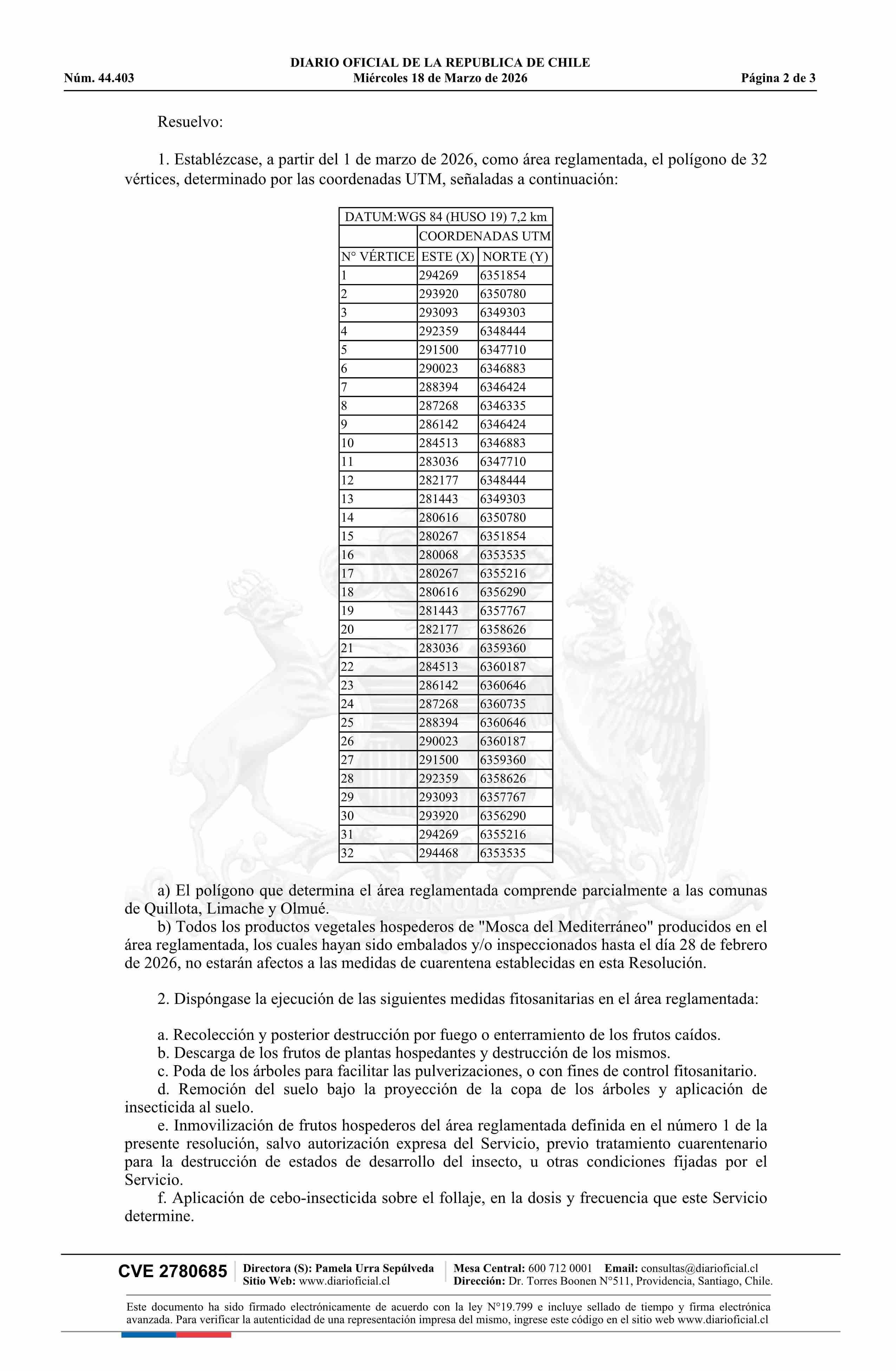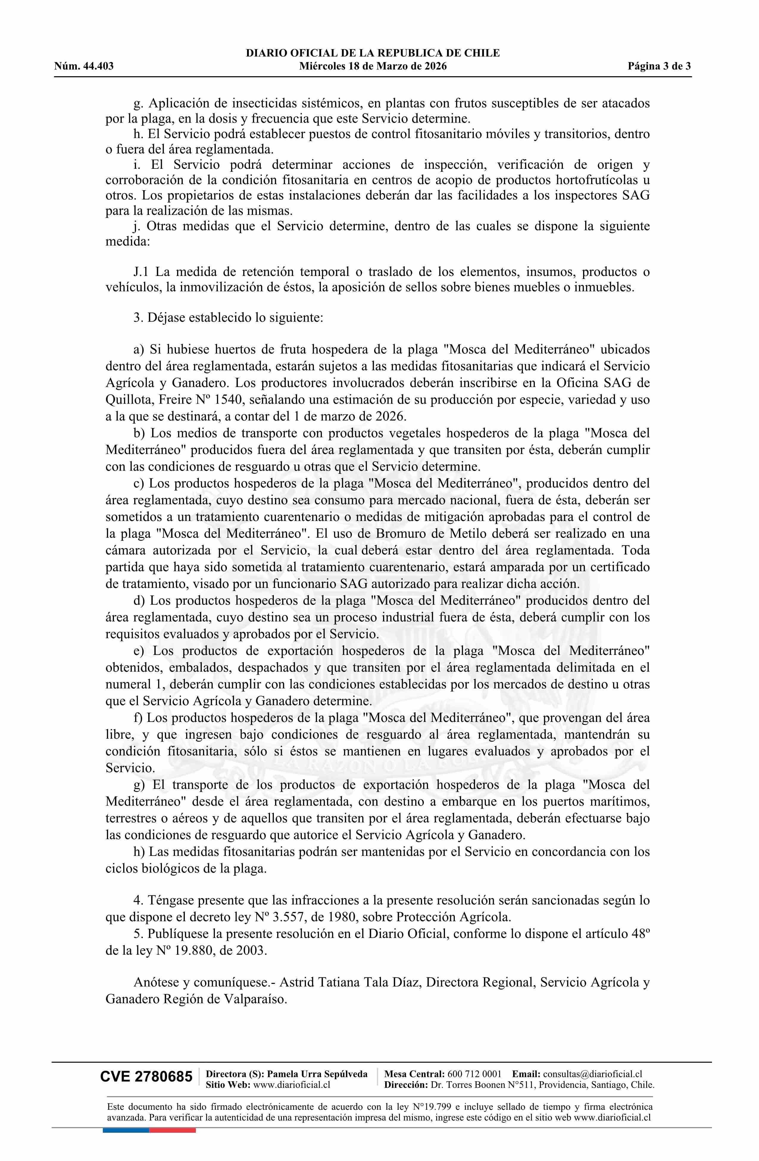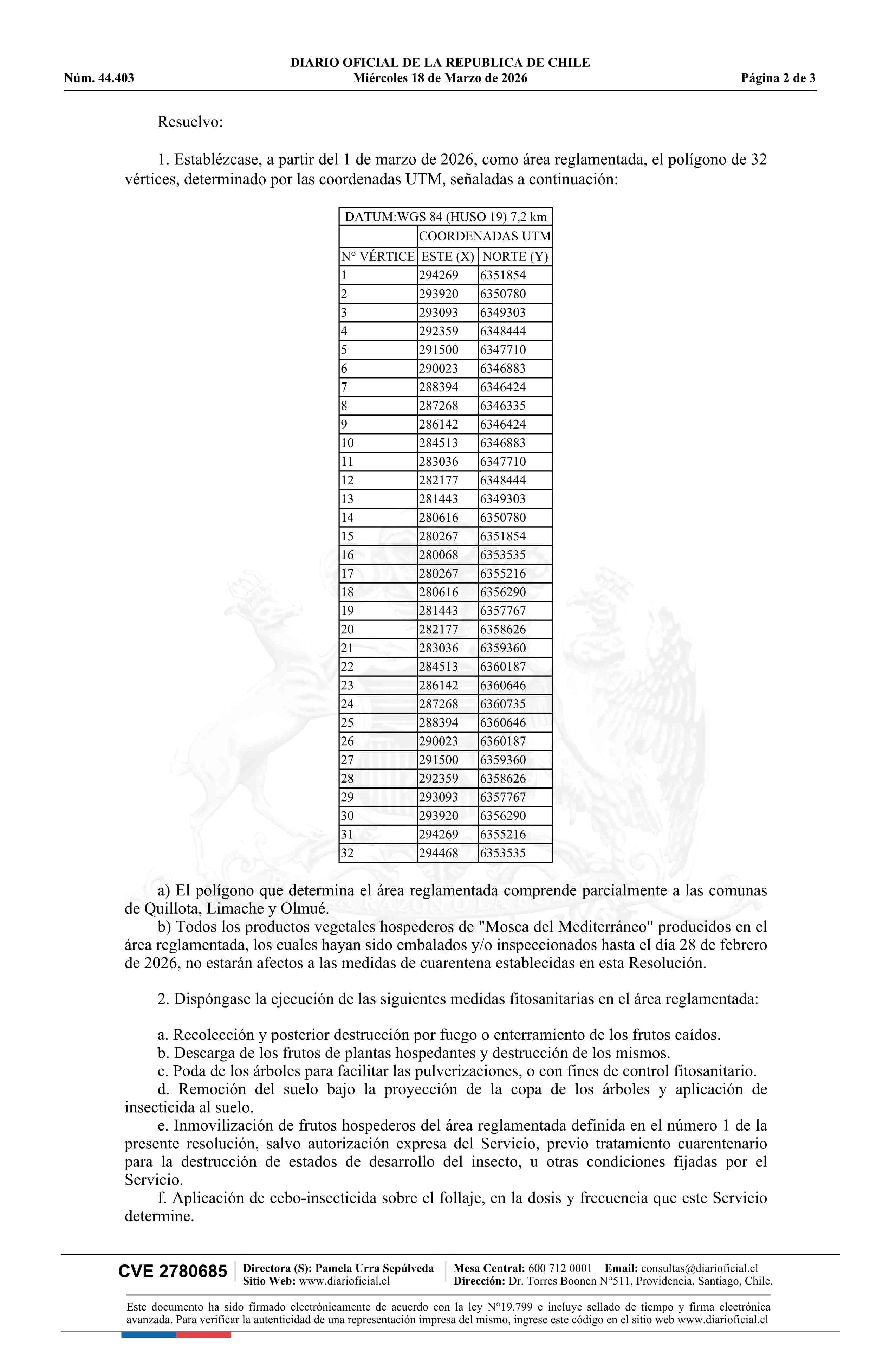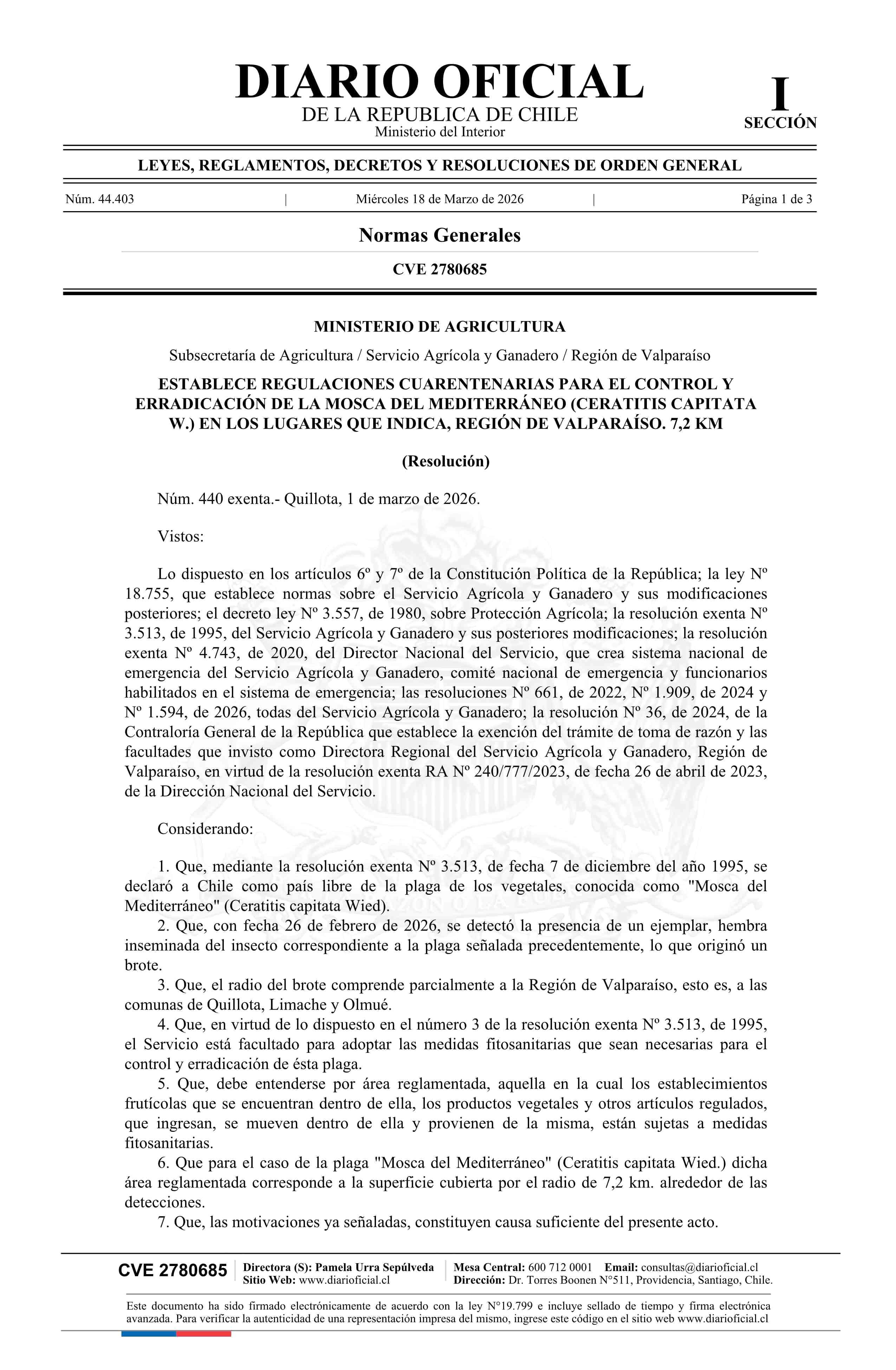 Título: Resolución exenta número 440, de 2026.- Establece regulaciones cuarentenarias para el control y erradicación de la Mosca del Mediterráneo (Ceratitis capitata W.) en los lugares que indica