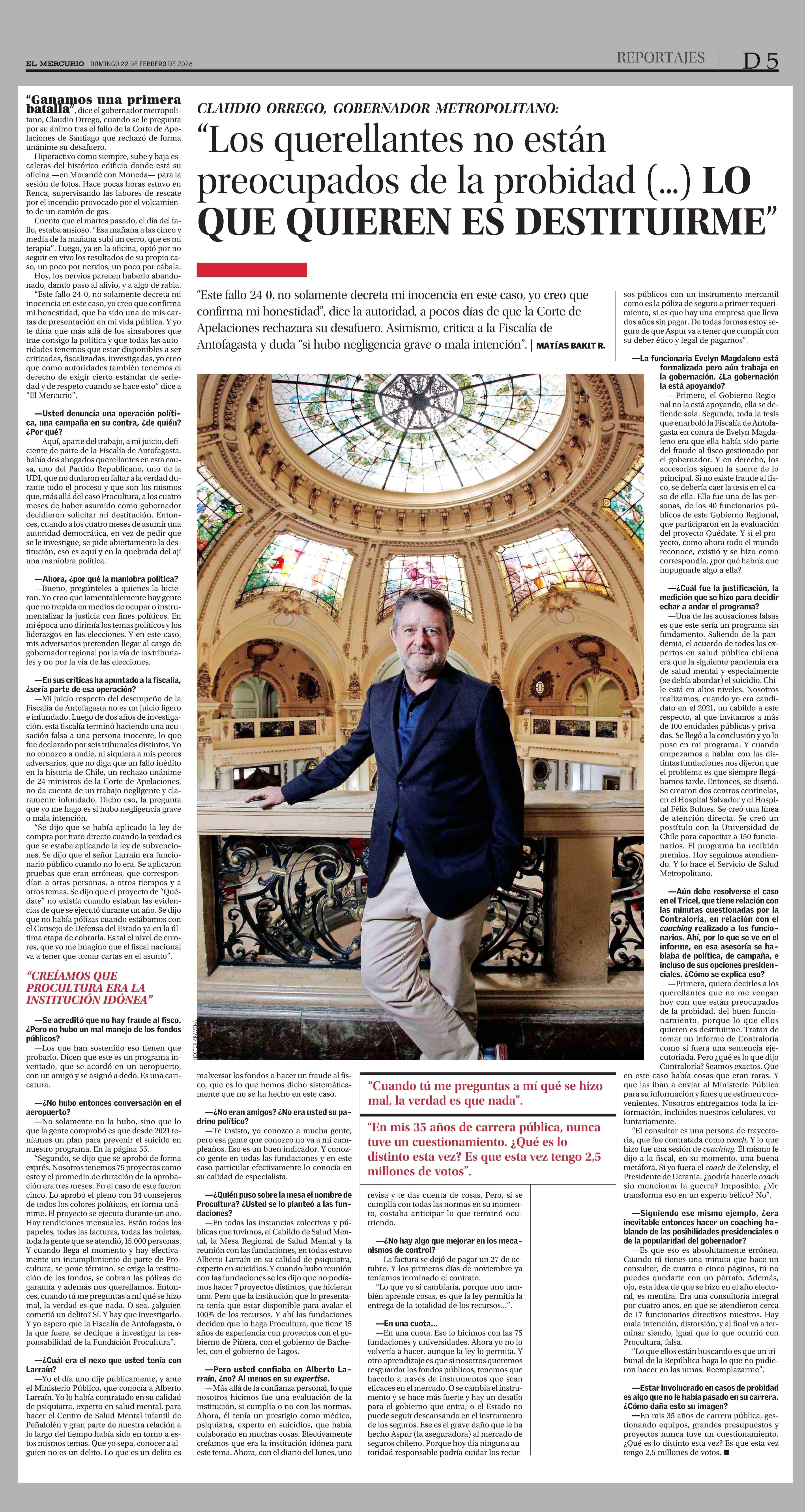 “Los querellantes no están preocupados de la probidad (...) LO QUE QUIEREN ES DESTITUIRME” 22-02-2026 El Mercurio |