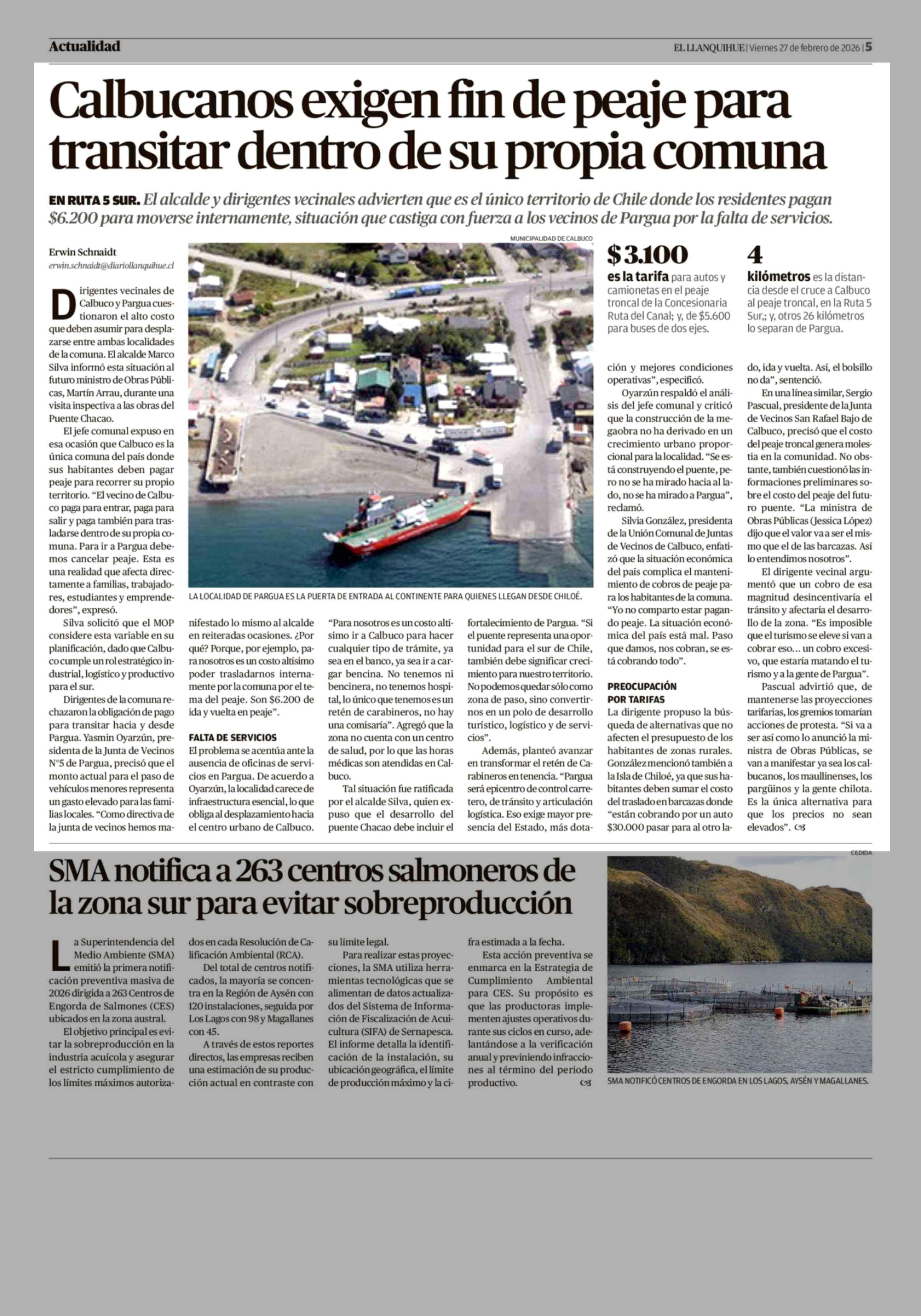 Calbucanos exigen fin de peaje para transitar dentro de su propia comuna 27-02-2026 El Llanquihue |
