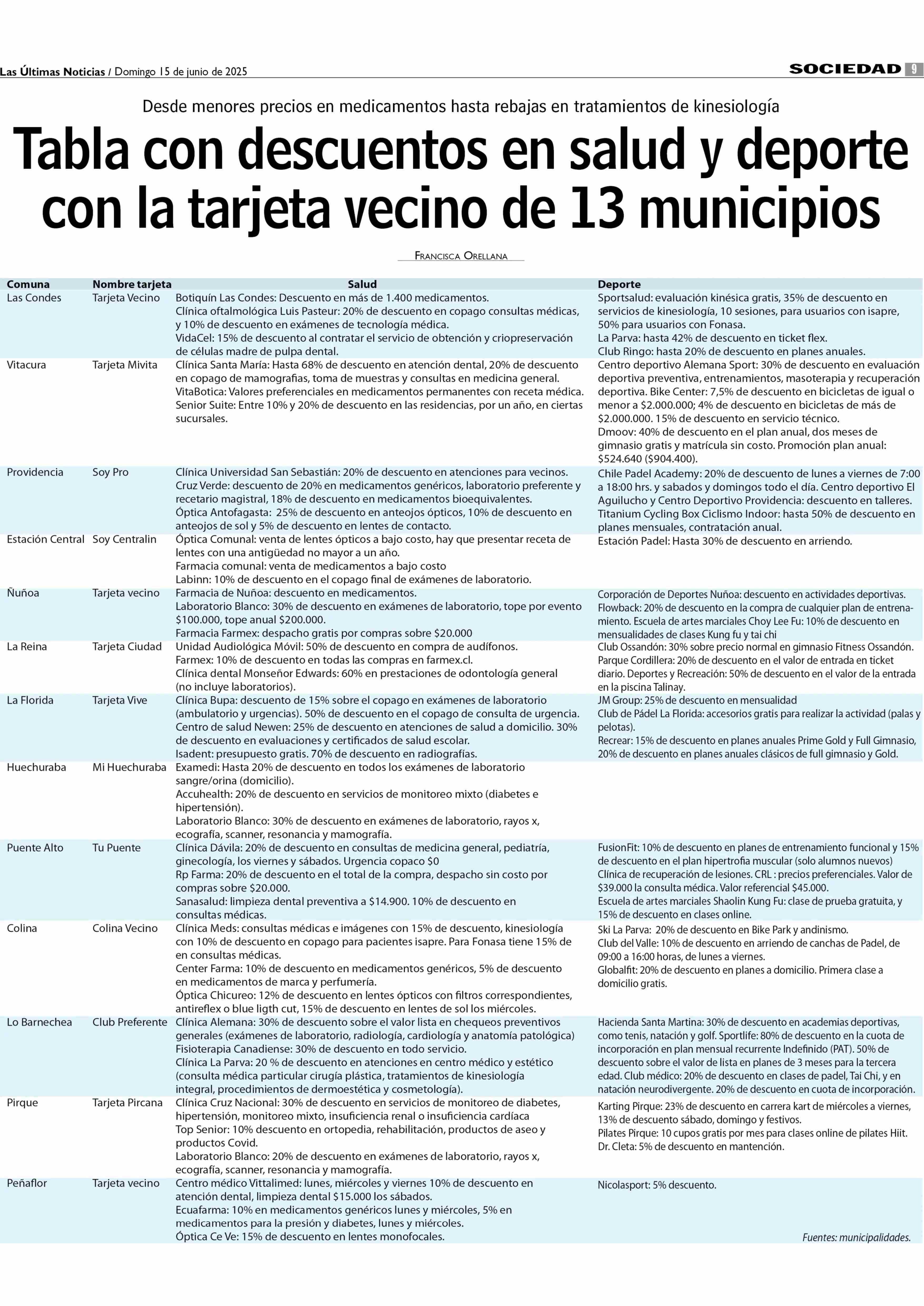 Tabla con descuentos en salud y deporte con la tarjeta vecino de 13 municipios 15-06-2025 Las Últimas Noticias |