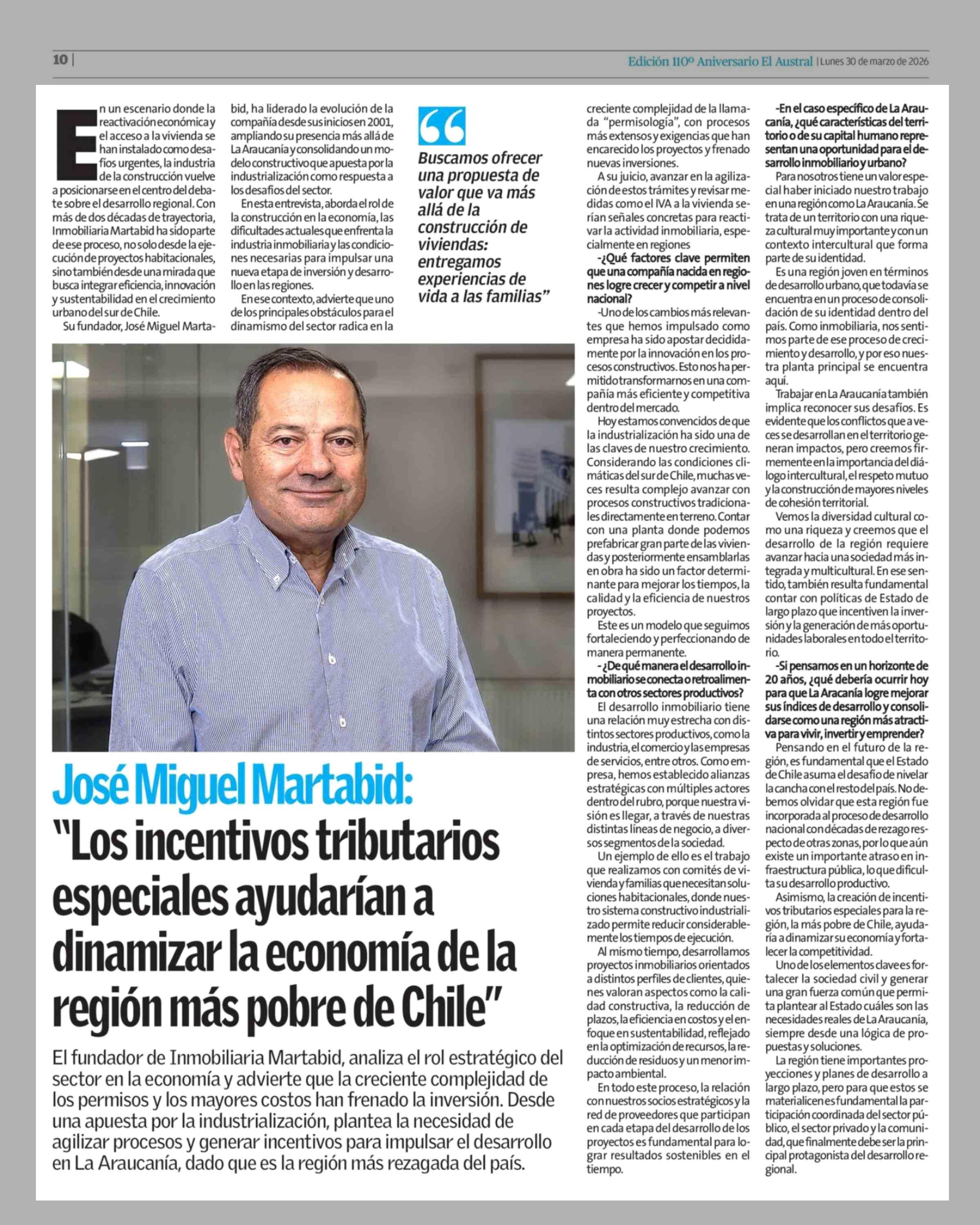 José Miguel Martabid: "Los incentivos tributarios especiales ayudarían a dinamizar la economía de la región más pobre de Chile" 30-03-2026 El Austral de la Araucanía |
