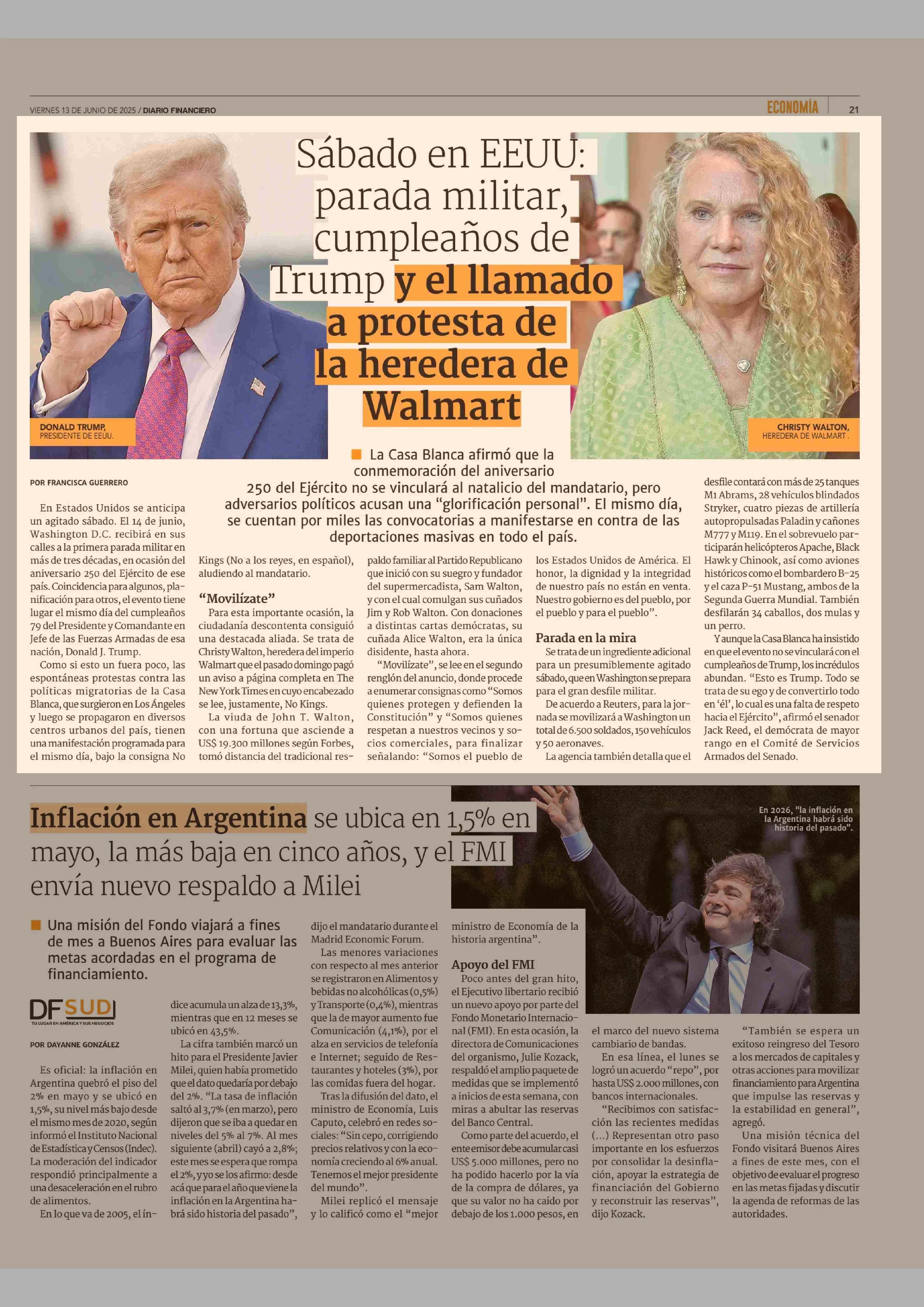 | Título: | Sábado en EEUU: parada militar, cumpleaños de Trump y el llamado a protesta de la heredera de Walmart |