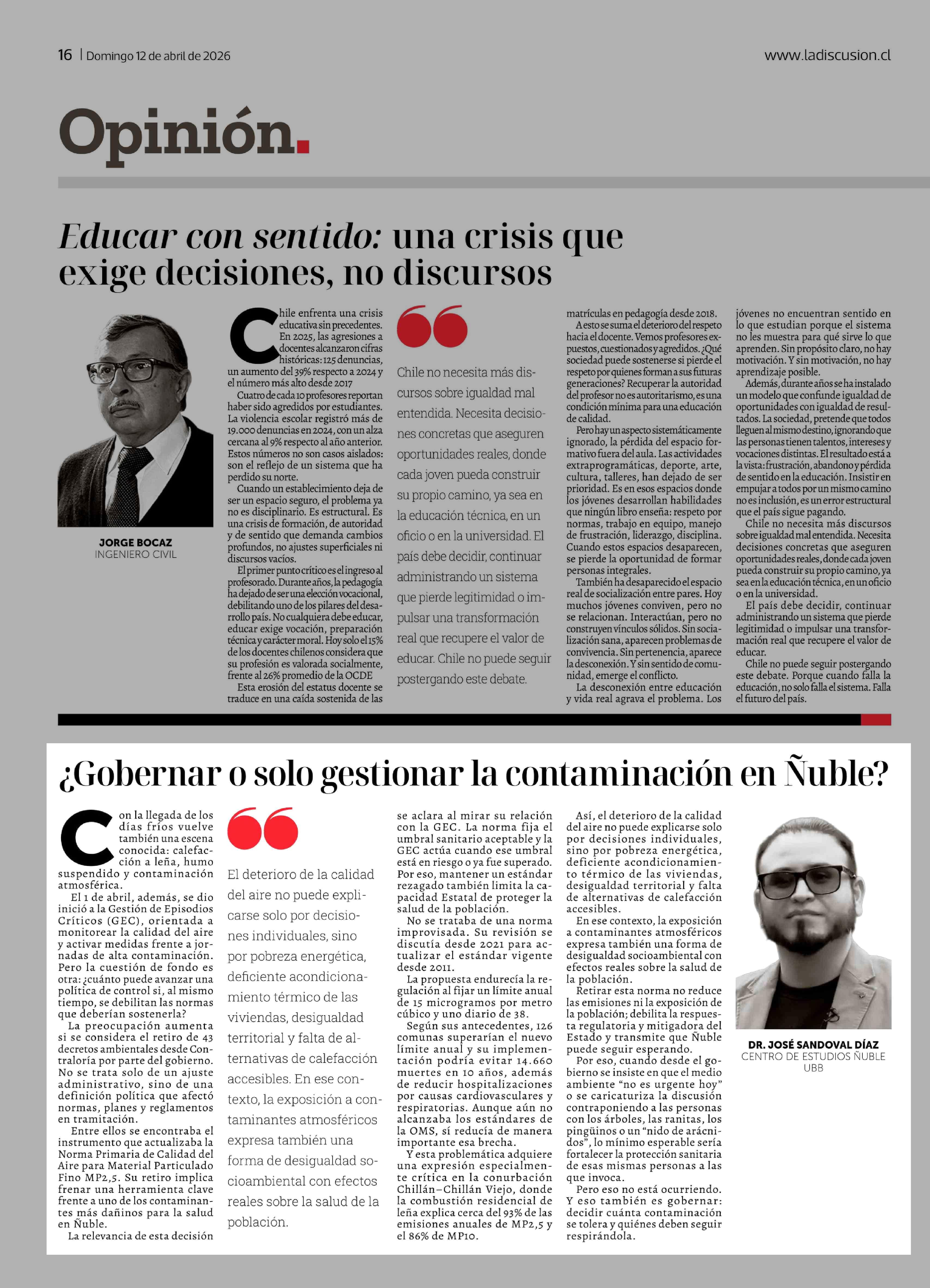 Columnas de Opinión: ¿Gobernar o solo gestionar la contaminación en Ñuble? 12-04-2026 La Discusión |