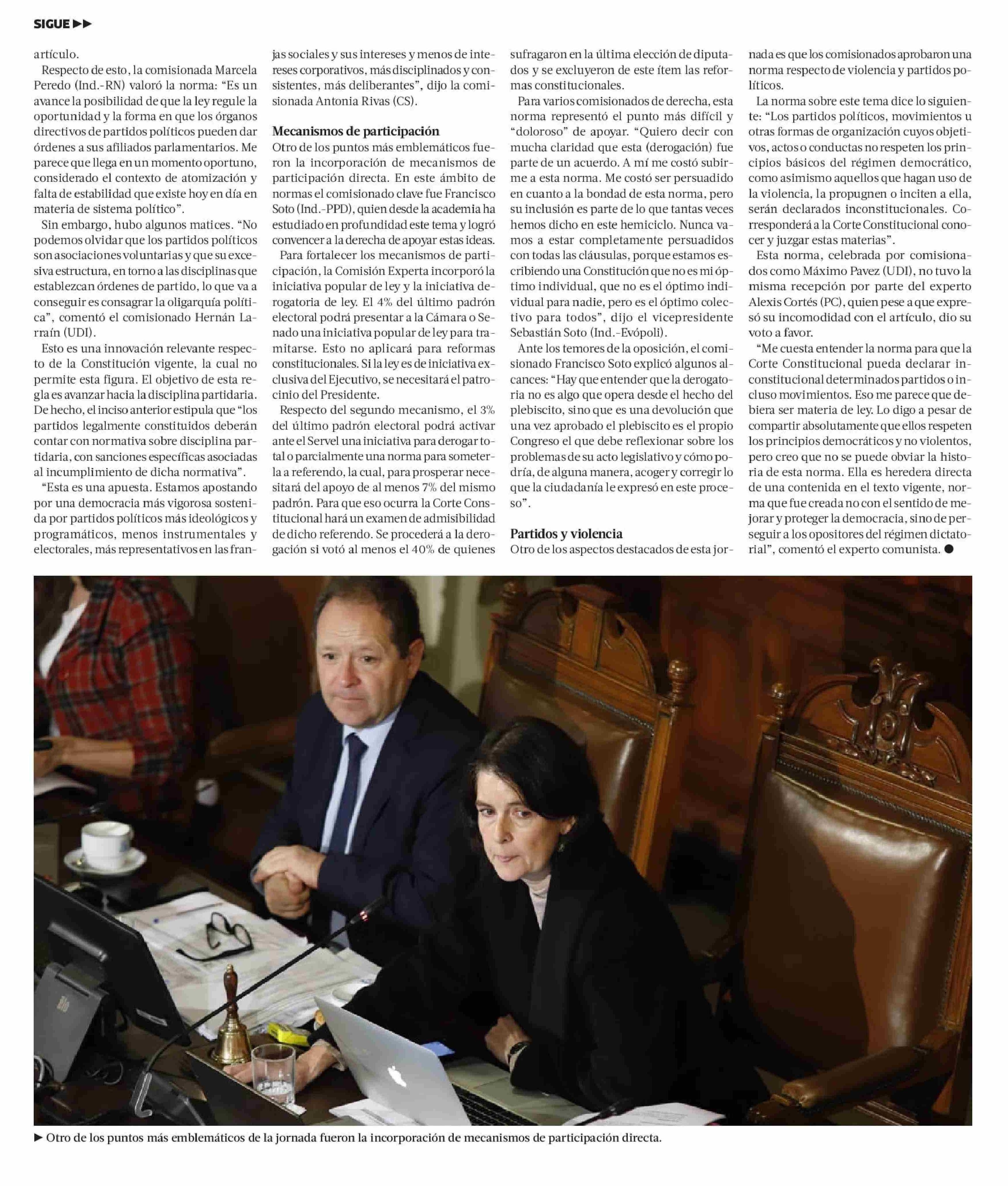 Comisión Experta aprueba órdenes de partido, derogación popular de leyes y la inconstitucionalidad de colectividades que inciten a la violencia 26-05-2023 La Tercera |