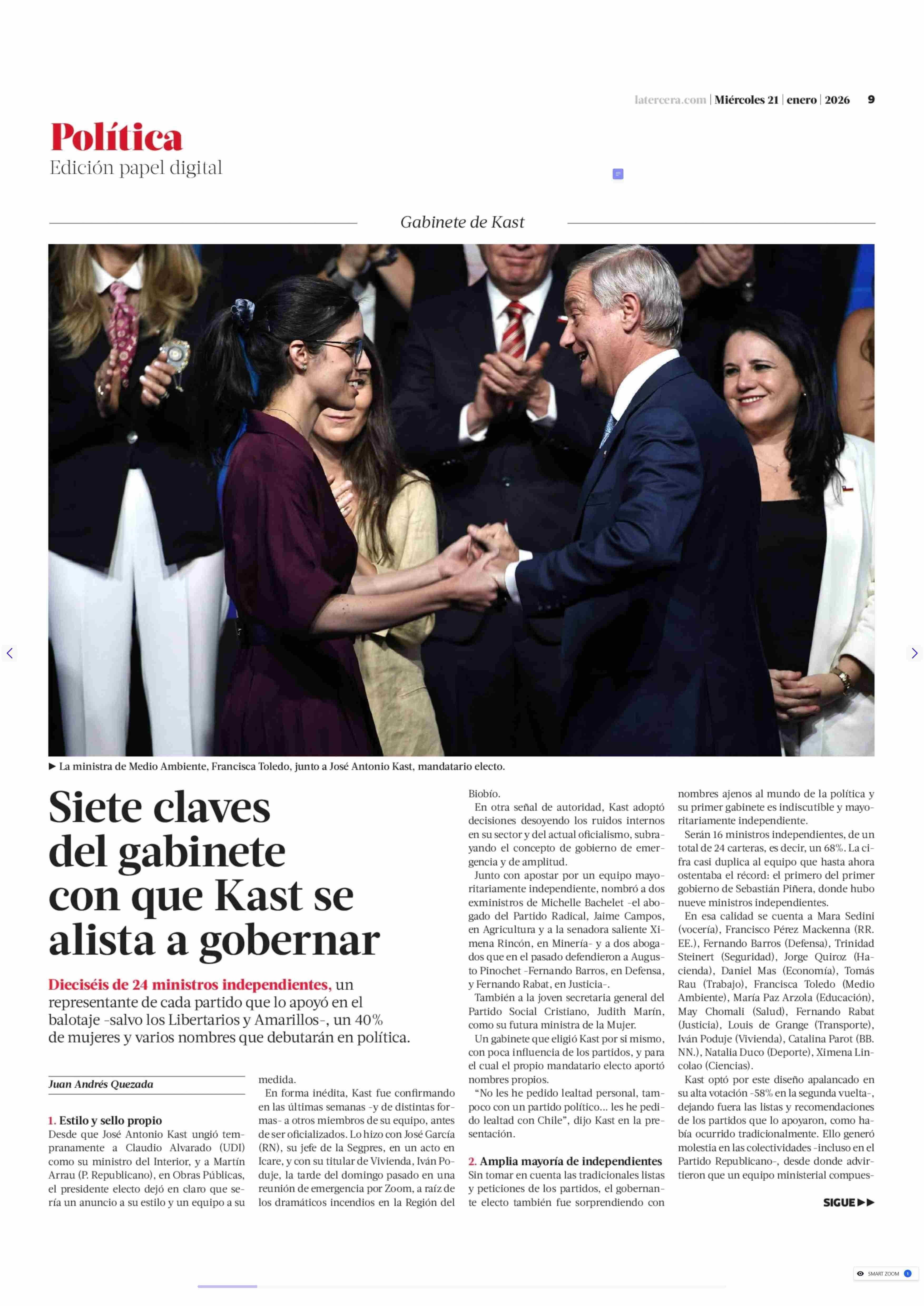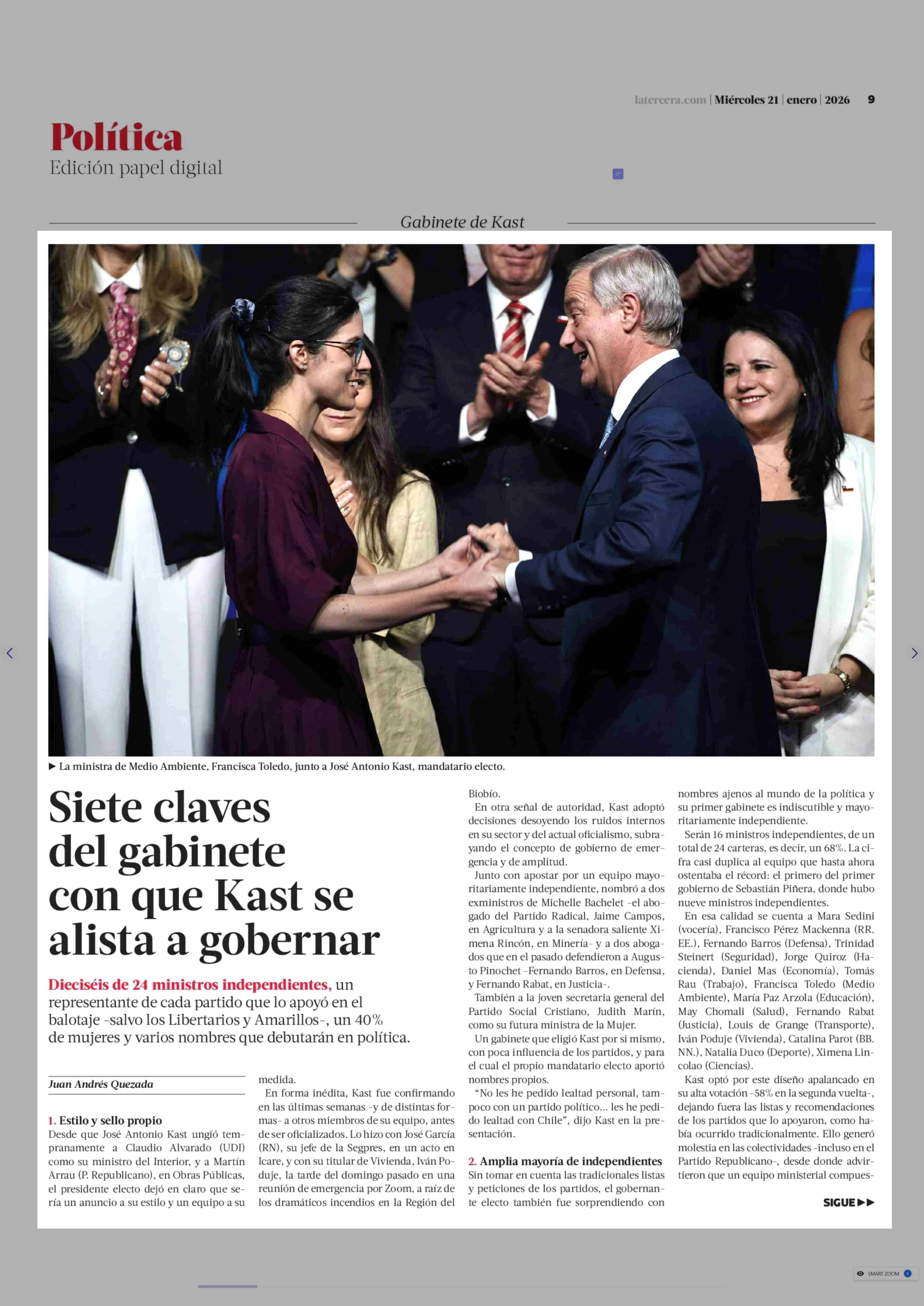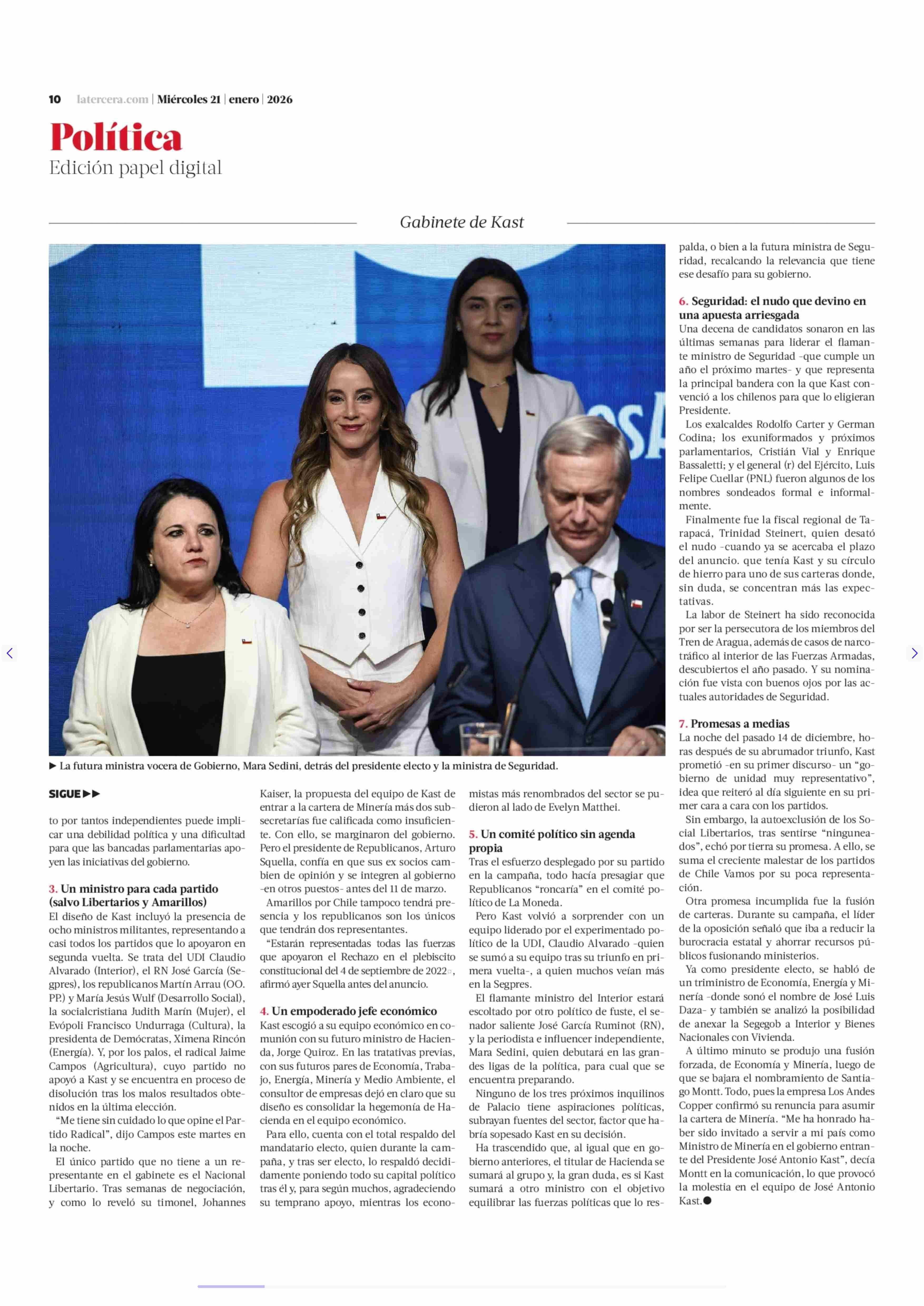 Siete claves del gabinete con que Kast se alista a gobernar 21-01-2026 La Tercera |