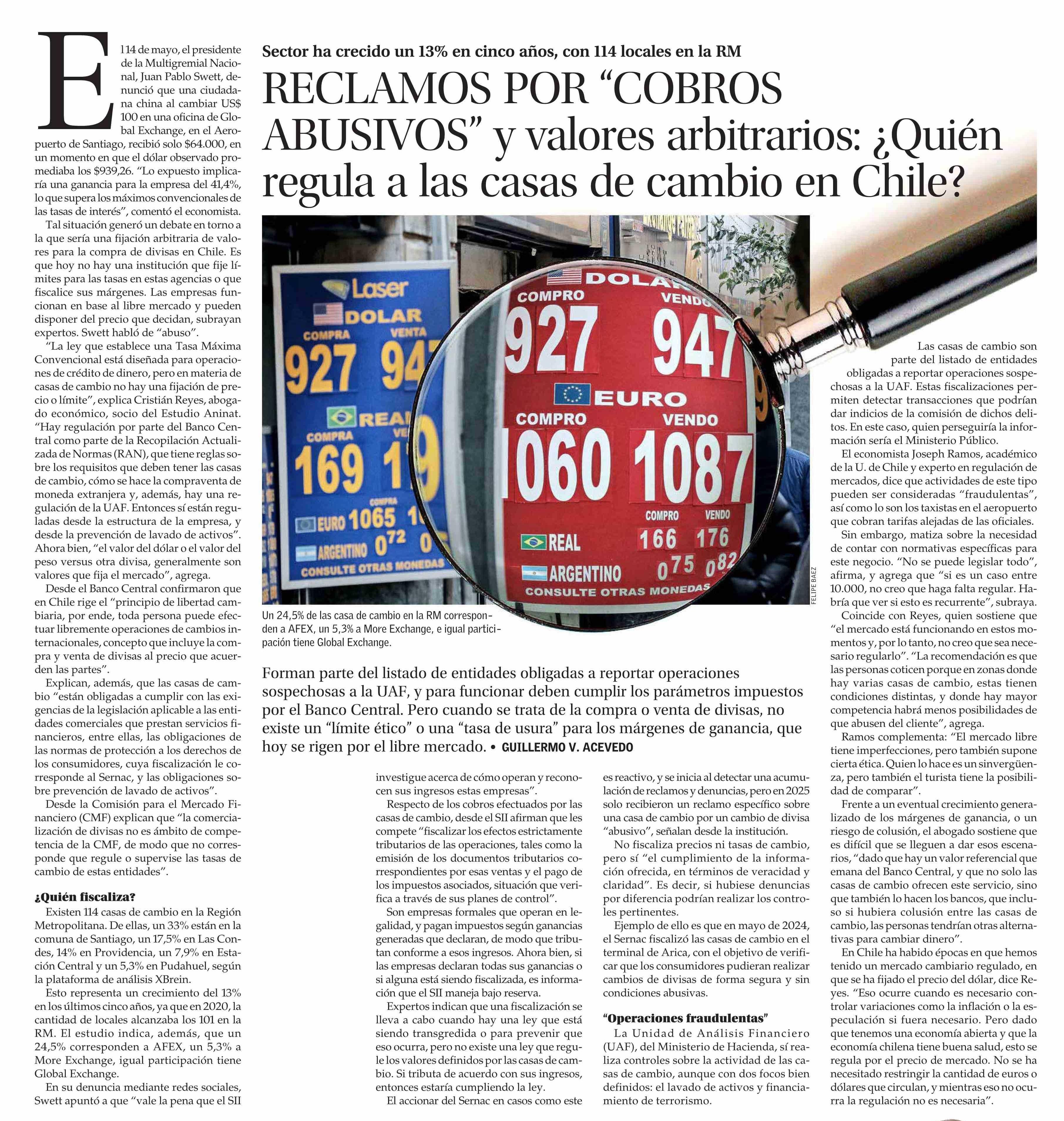 RECLAMOS POR "COBROS ABUSIVOS" y valores arbitrarios: ¿Quién regula a las casas de cambio en Chile? 08-06-2025 El Mercurio |
