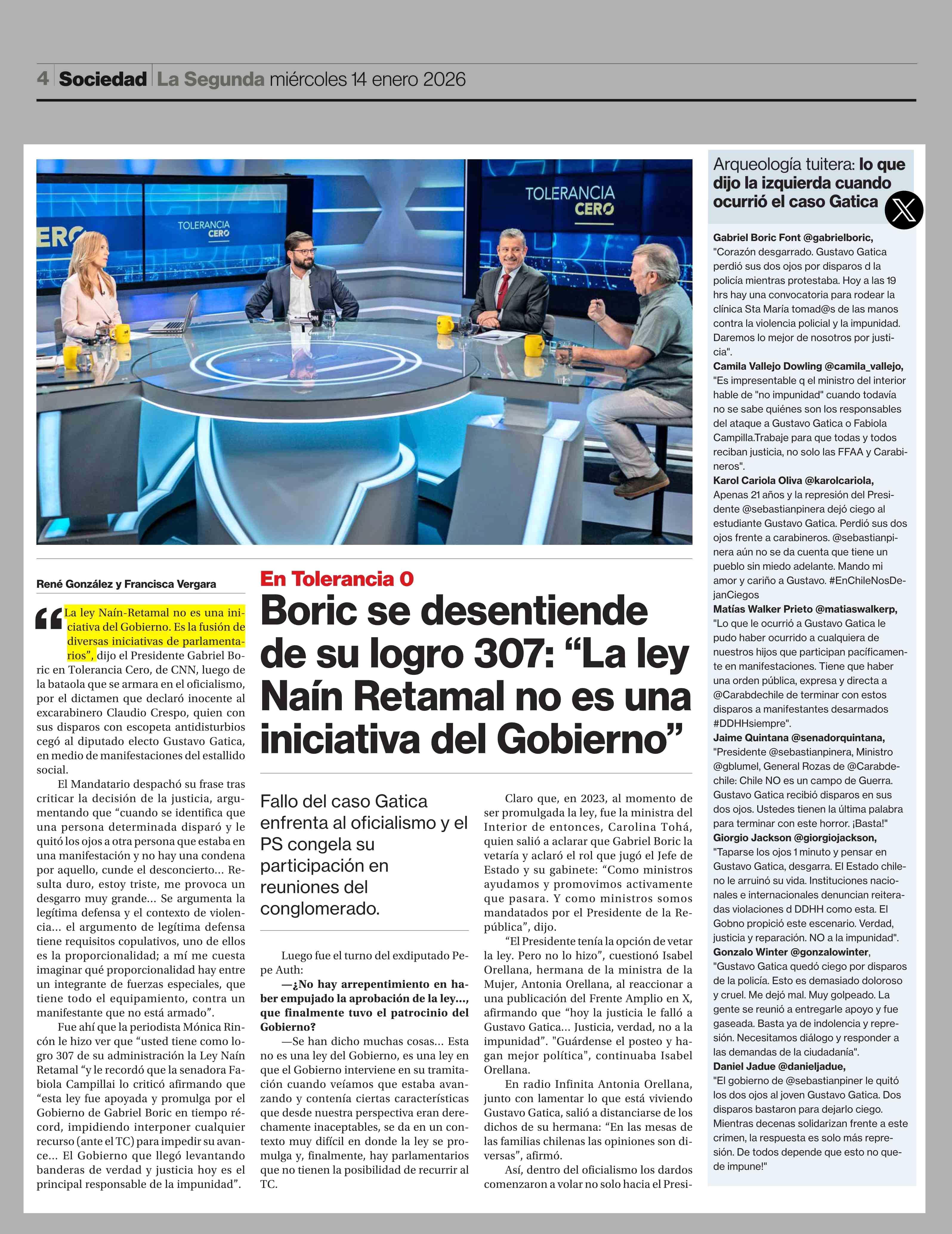 Boric se desentiende de su logro 307: "La ley Naín Retamal no es una iniciativa del Gobierno" 14-01-2026 La Segunda |