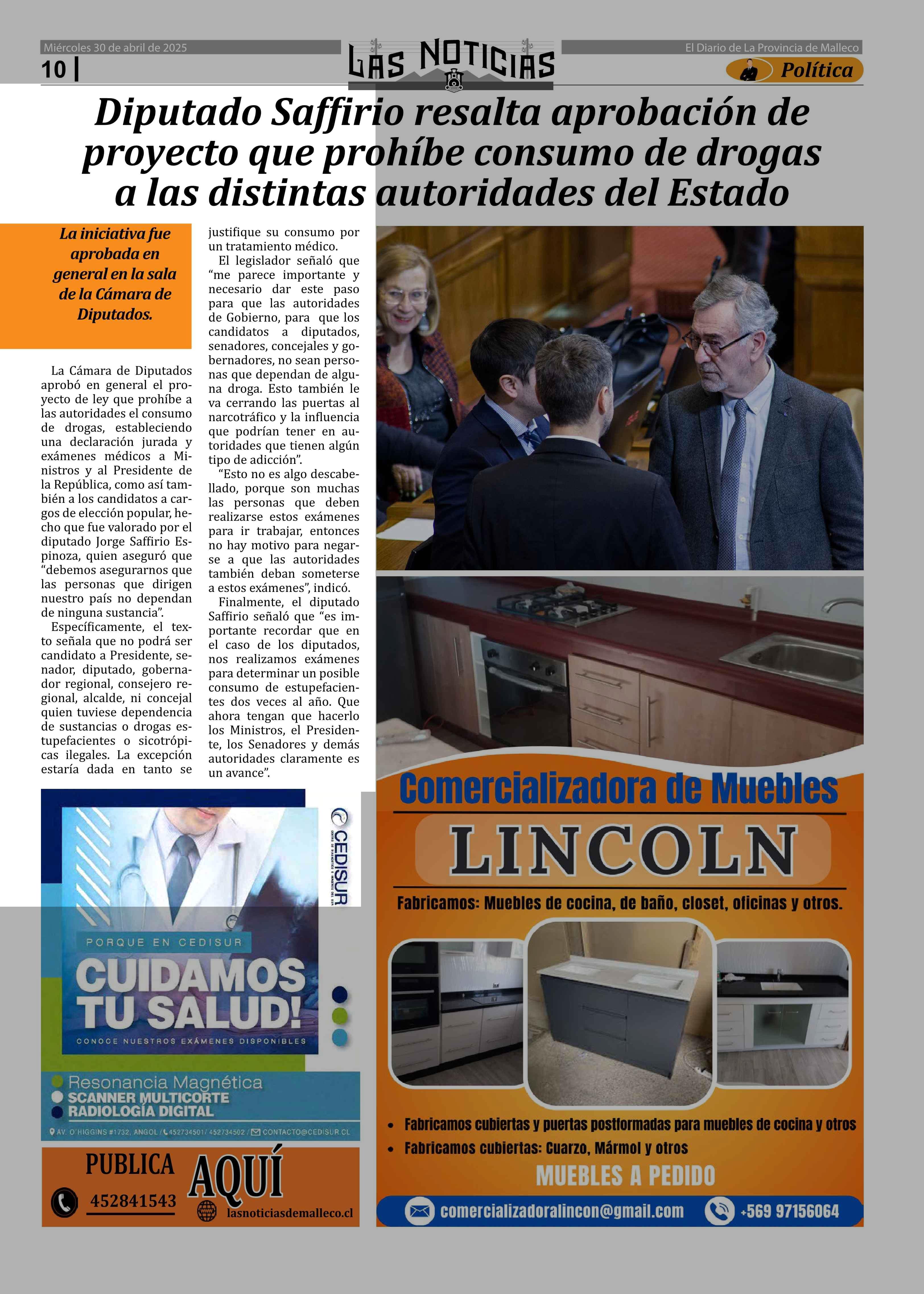 Diputado Saffirio resalta aprobación de proyecto que prohíbe consumo de drogas a las distintas autoridades del Estado 30-04-2025 Las Noticias |