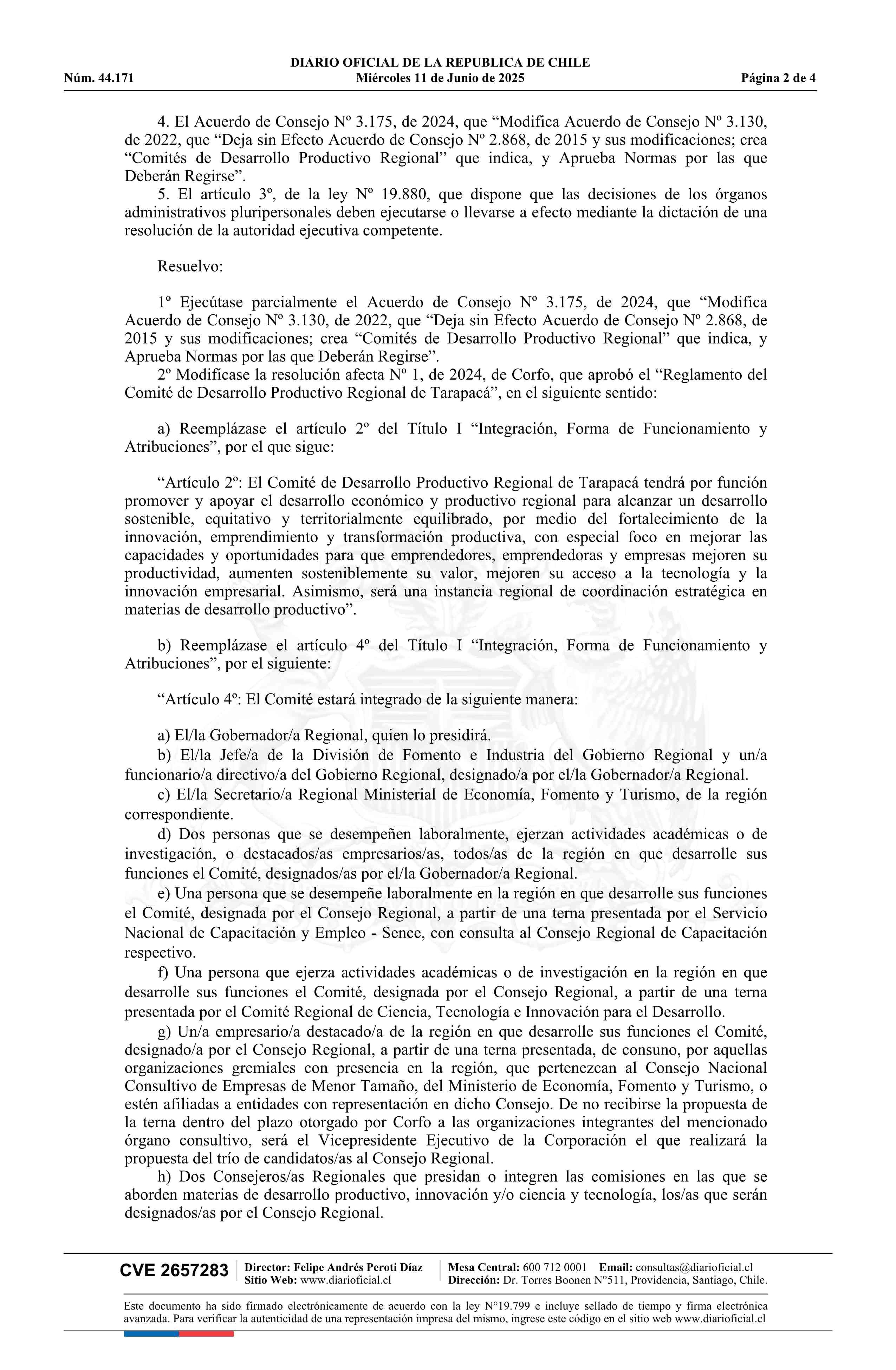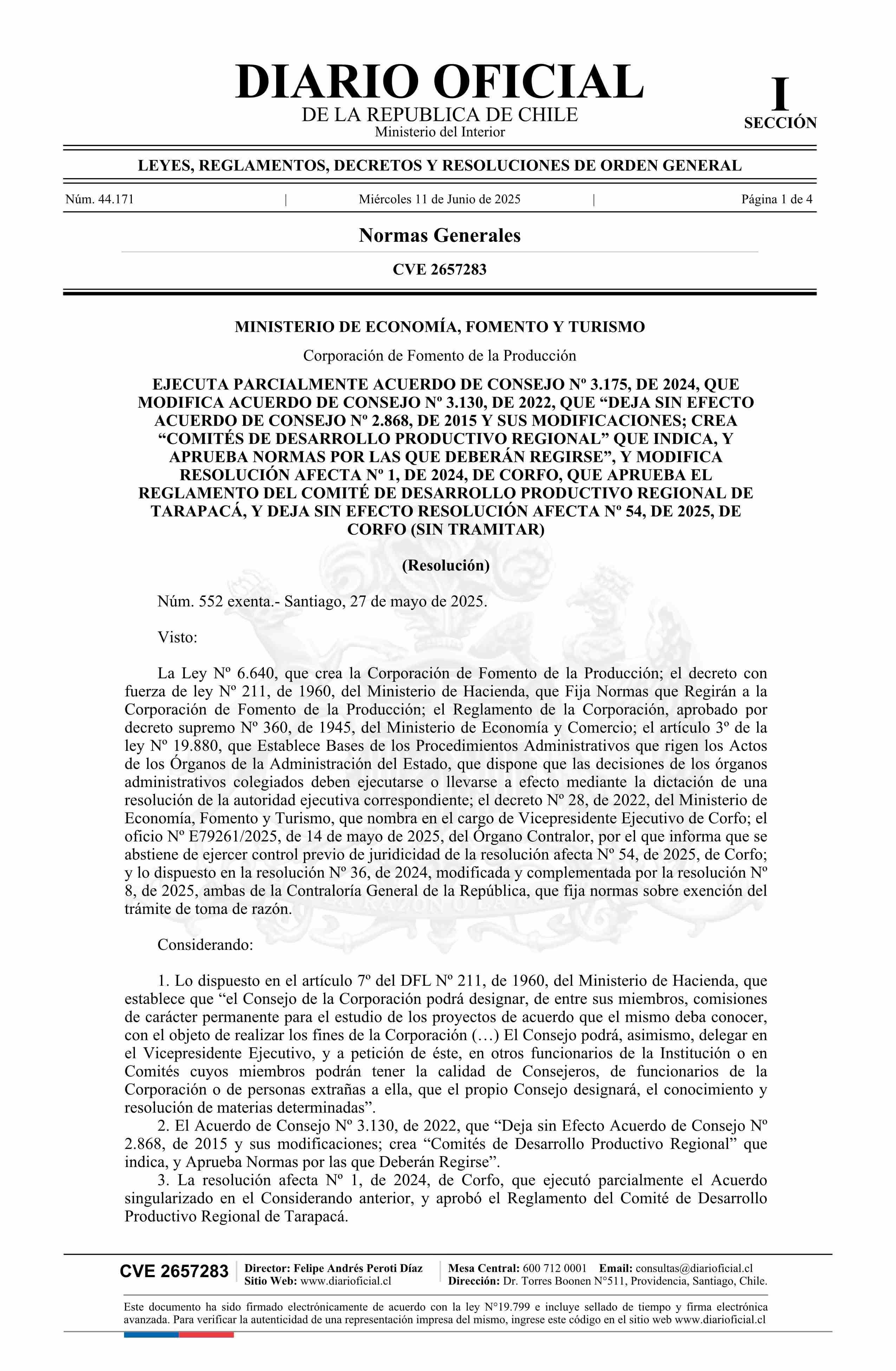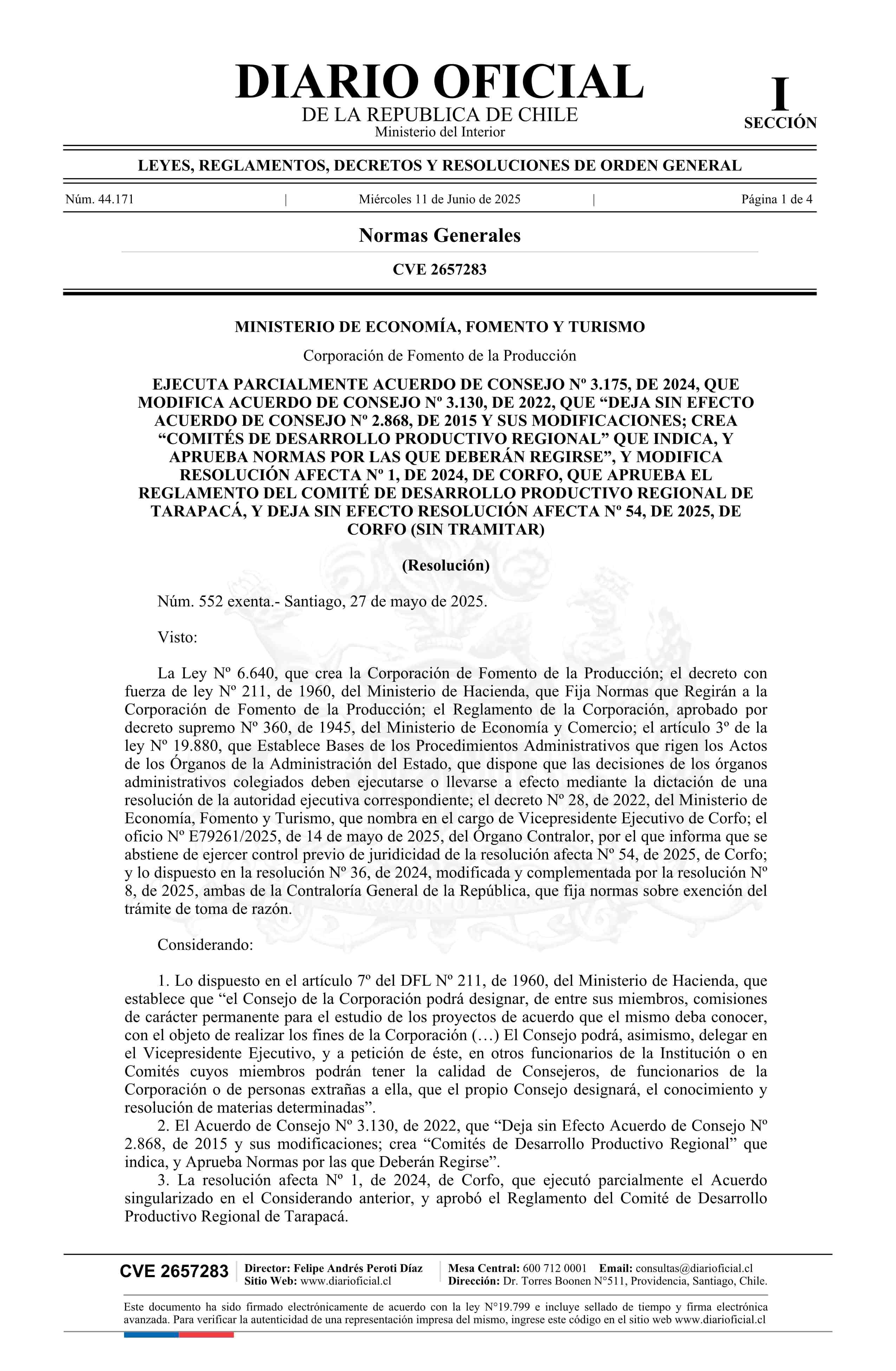 | Título: | Resolución exenta número 552, de 2025.- Ejecuta parcialmente Acuerdo de Consejo Nº 3.175, de 2024, que modifica Acuerdo de Consejo Nº 3.130, de 2022, que deja sin efecto Acuerdo de Consejo Nº 2.868, de 2015 y sus modificaciones; crea Comités de Desarrollo Productivo Regional que indica, y aprueba no |