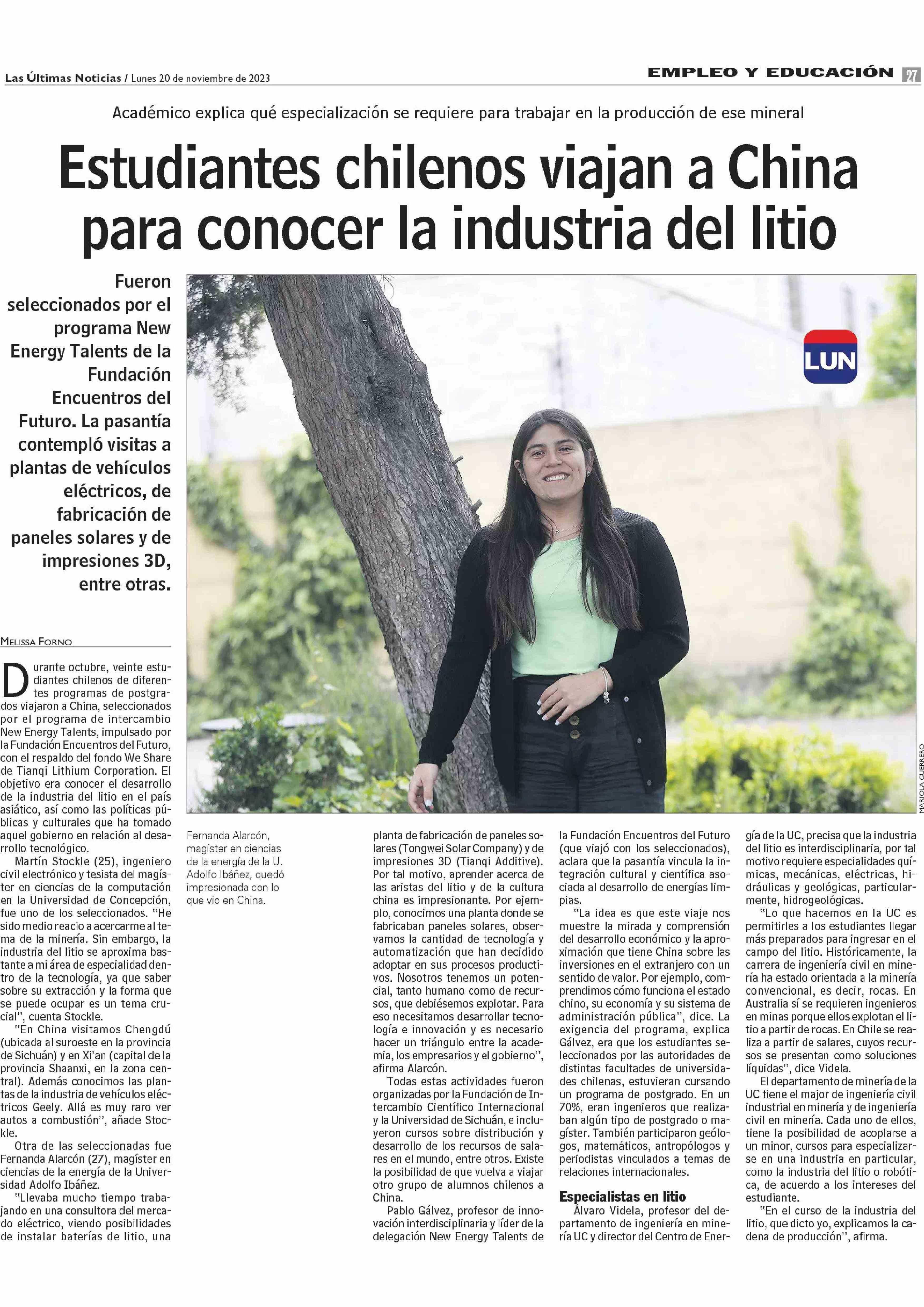 Estudiantes chilenos viajan a China para conocer la industria del Íitio 20-11-2023 Las Últimas Noticias |