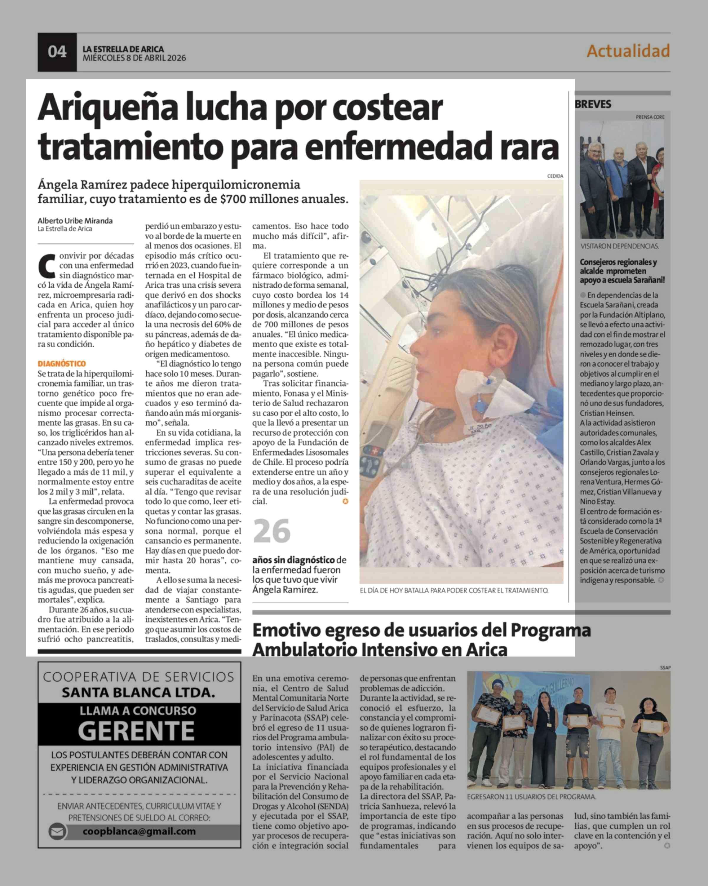Ariqueña lucha por costear tratamiento para enfermedad rara 08-04-2026 La Estrella de Arica |