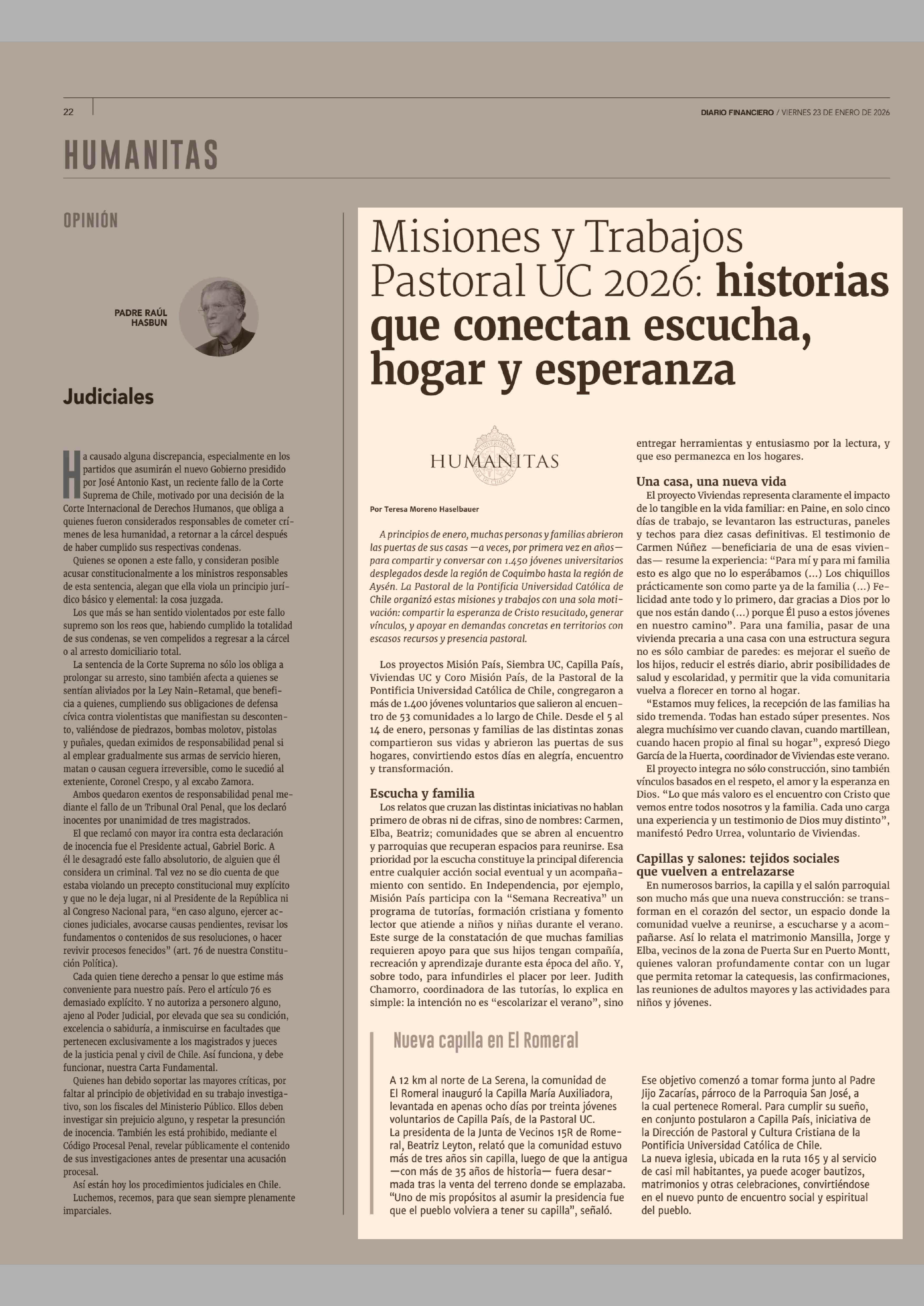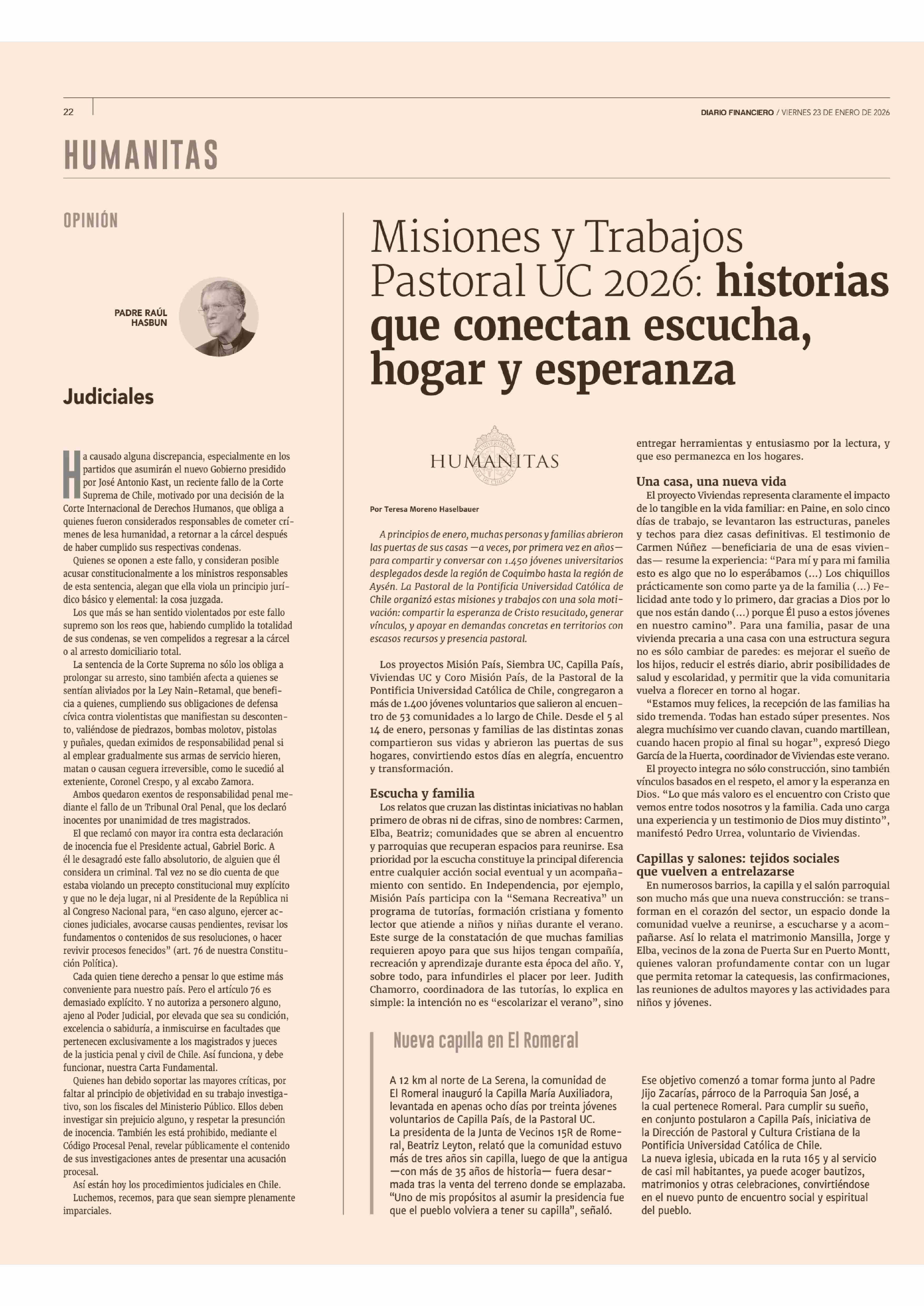 Misiones y Trabajos Pastoral UC 2026: historias que conectan escucha, hogar y esperanza 23-01-2026 Diario Financiero |