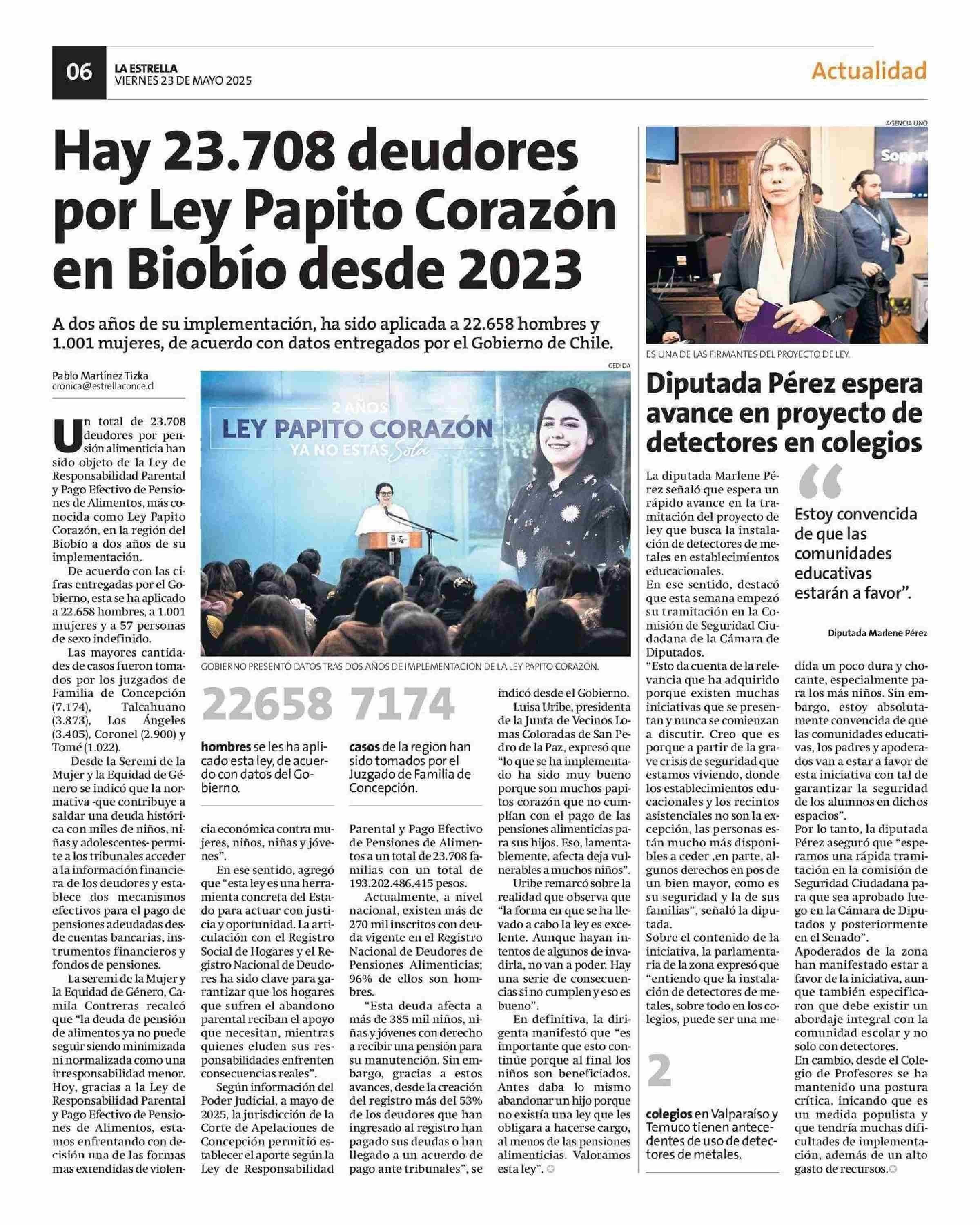Diputada Pérez espera avance en proyecto de detectores en colegios 23-05-2025 La Estrella de Concepción |