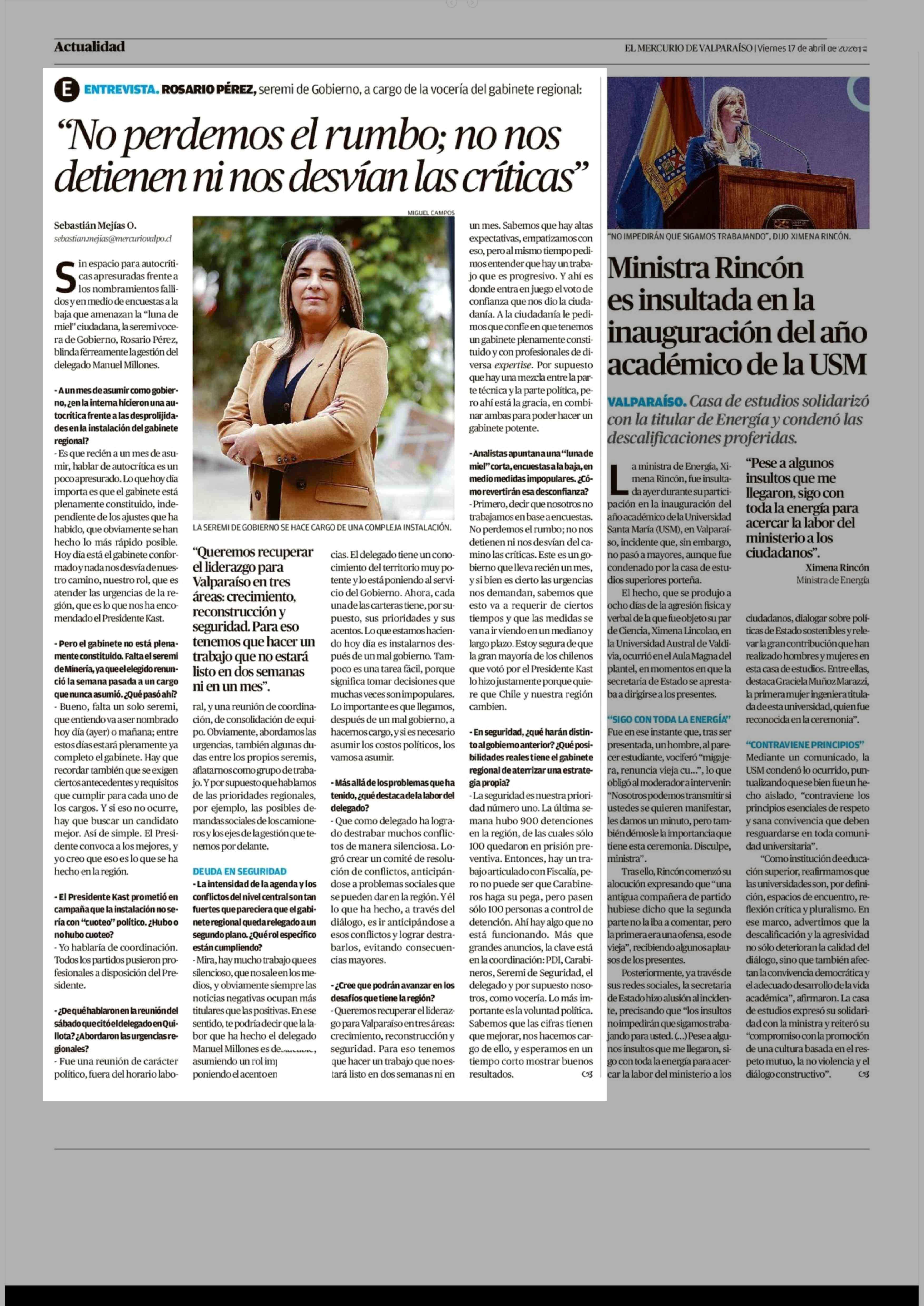 "No perdemos el rumbo; no nos detienen ni nos desvían las críticas" 17-04-2026 El Mercurio de Valparaíso |