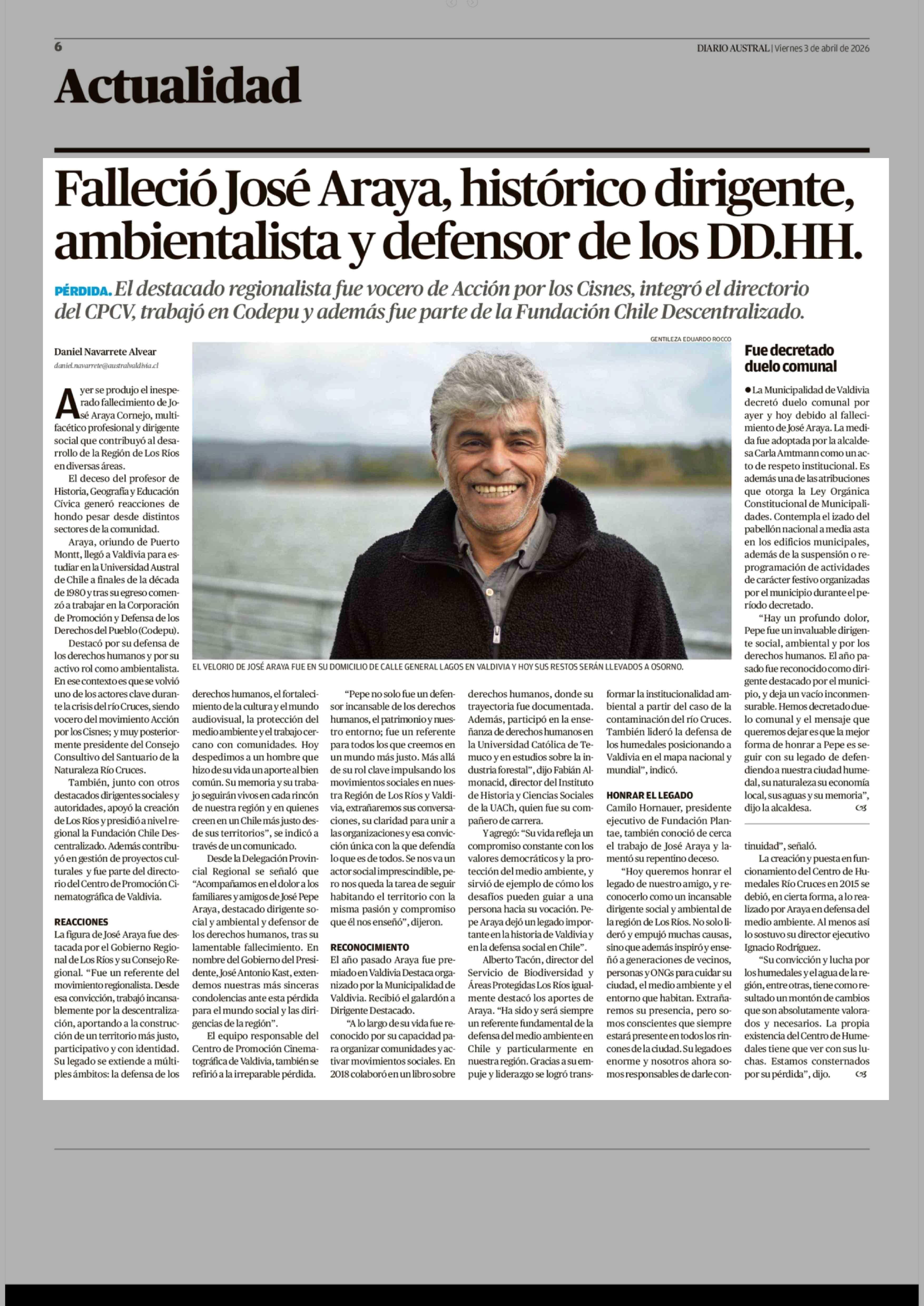 Falleció José Araya, histórico dirigente, ambientalista y defensor de los DD.HH. 03-04-2026 Diario Austral Región de Los Ríos |