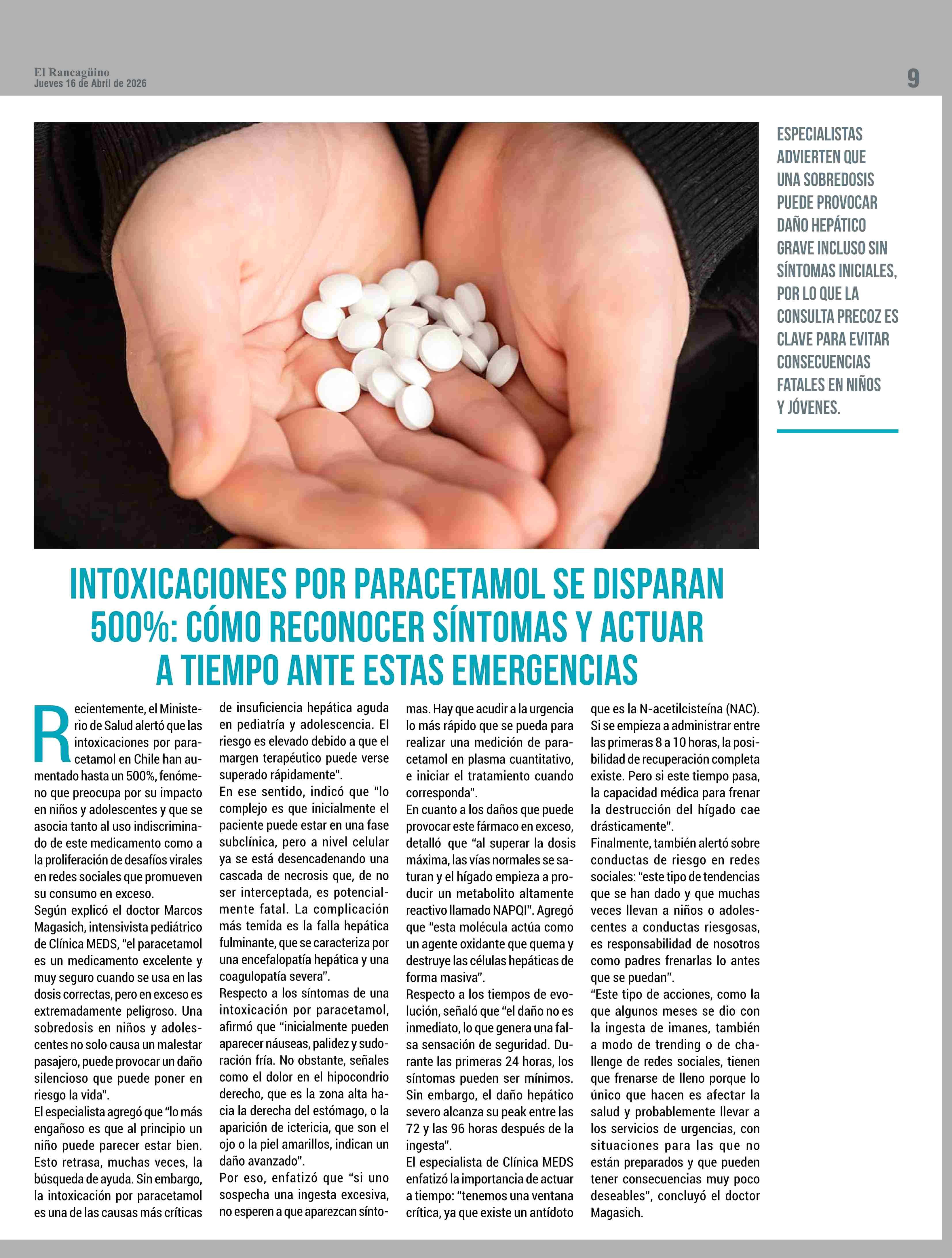INTOXICACIONES POR PARACETAMOL SE DISPARAN 900%: COMO RECONOCER SINTOMAS Y ACTUAR A TIEMPO ANTE ESTAS EMERGENCIAS 16-04-2026 El Rancagüino |