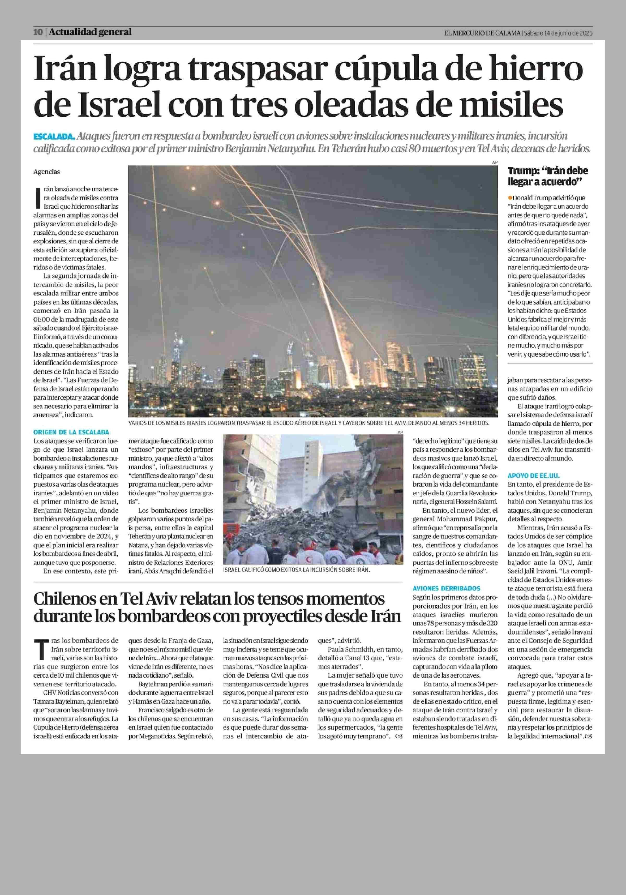 Irán logra traspasar cúpula de hierro de Israel con tres oleadas de misiles 14-06-2025 El Mercurio de Calama |