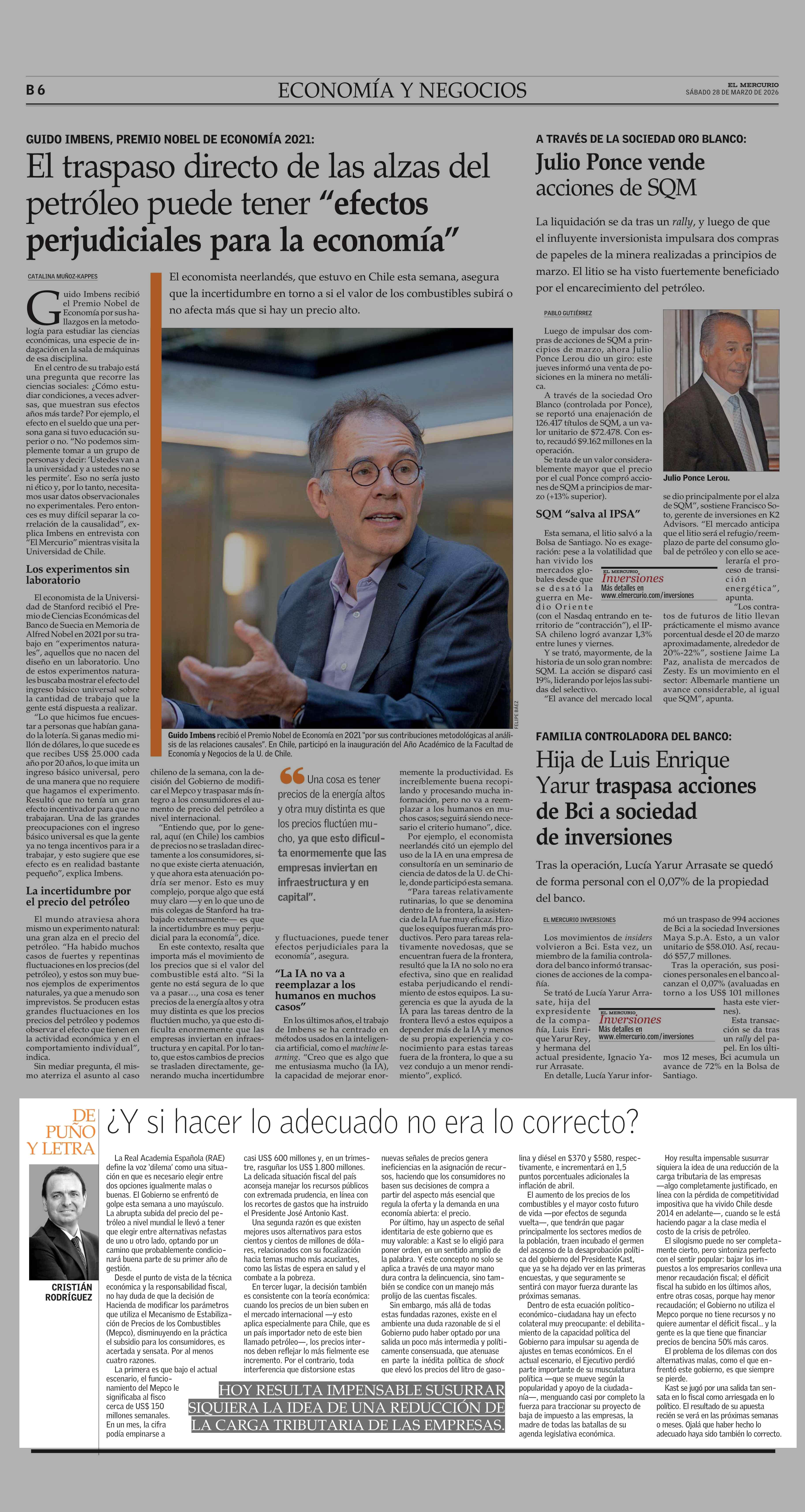 Columnas de Opinión: DE PUÑO ¿Y si hacer lo adecuado no era lo correcto? 28-03-2026 El Mercurio |