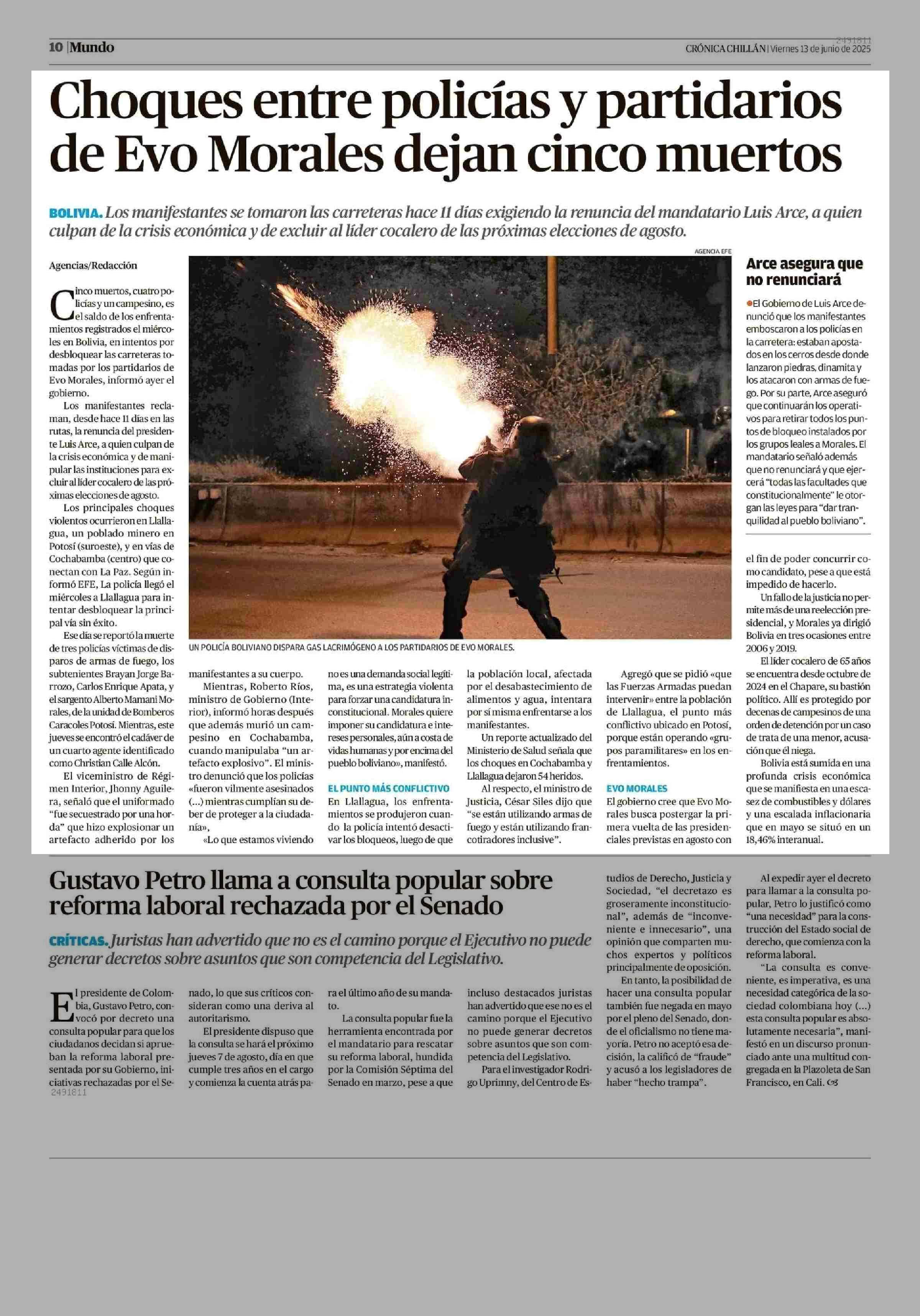 Choques entre policías y partidarios de Evo Morales dejan cinco muertos 13-06-2025 Crónica de Chillán |