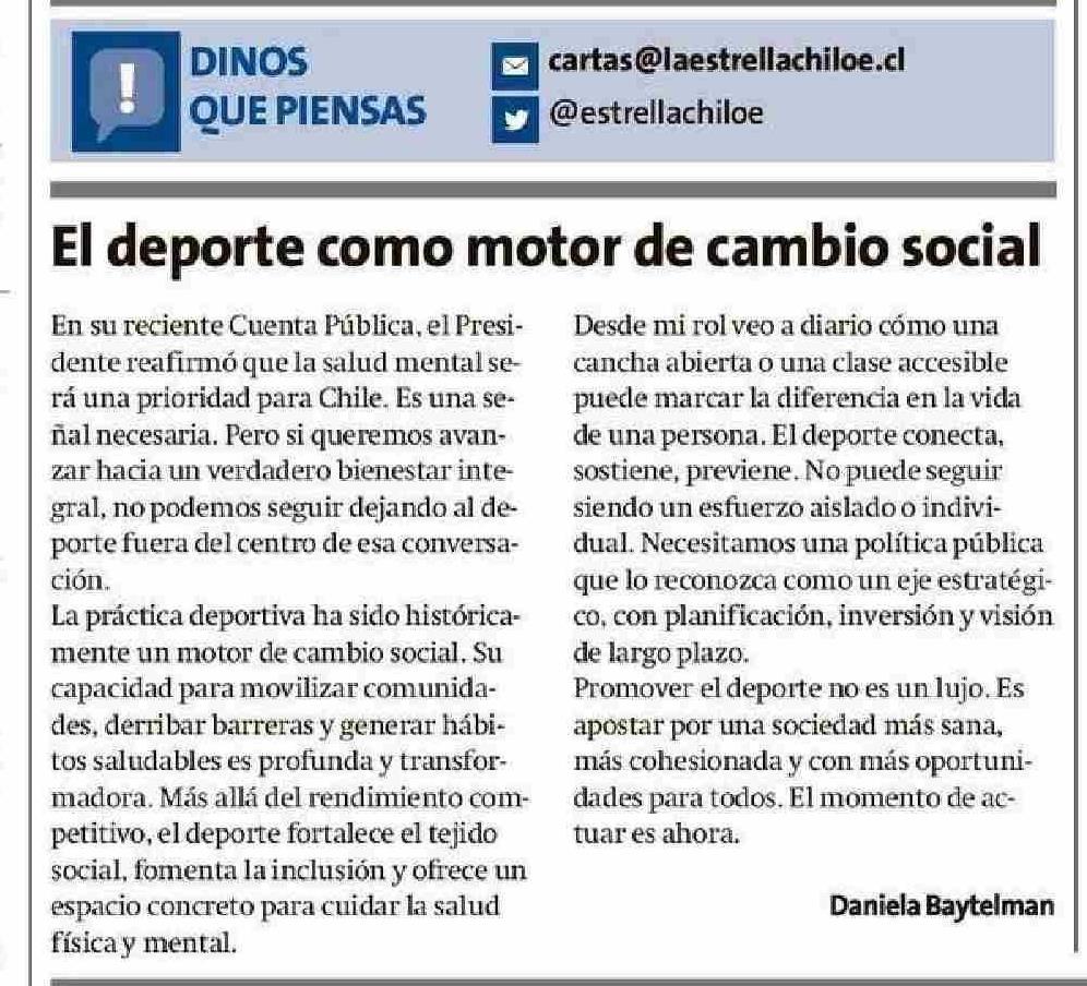 Cartas: El deporte como motor de cambio social 08-06-2025 La Estrella de Chiloé |