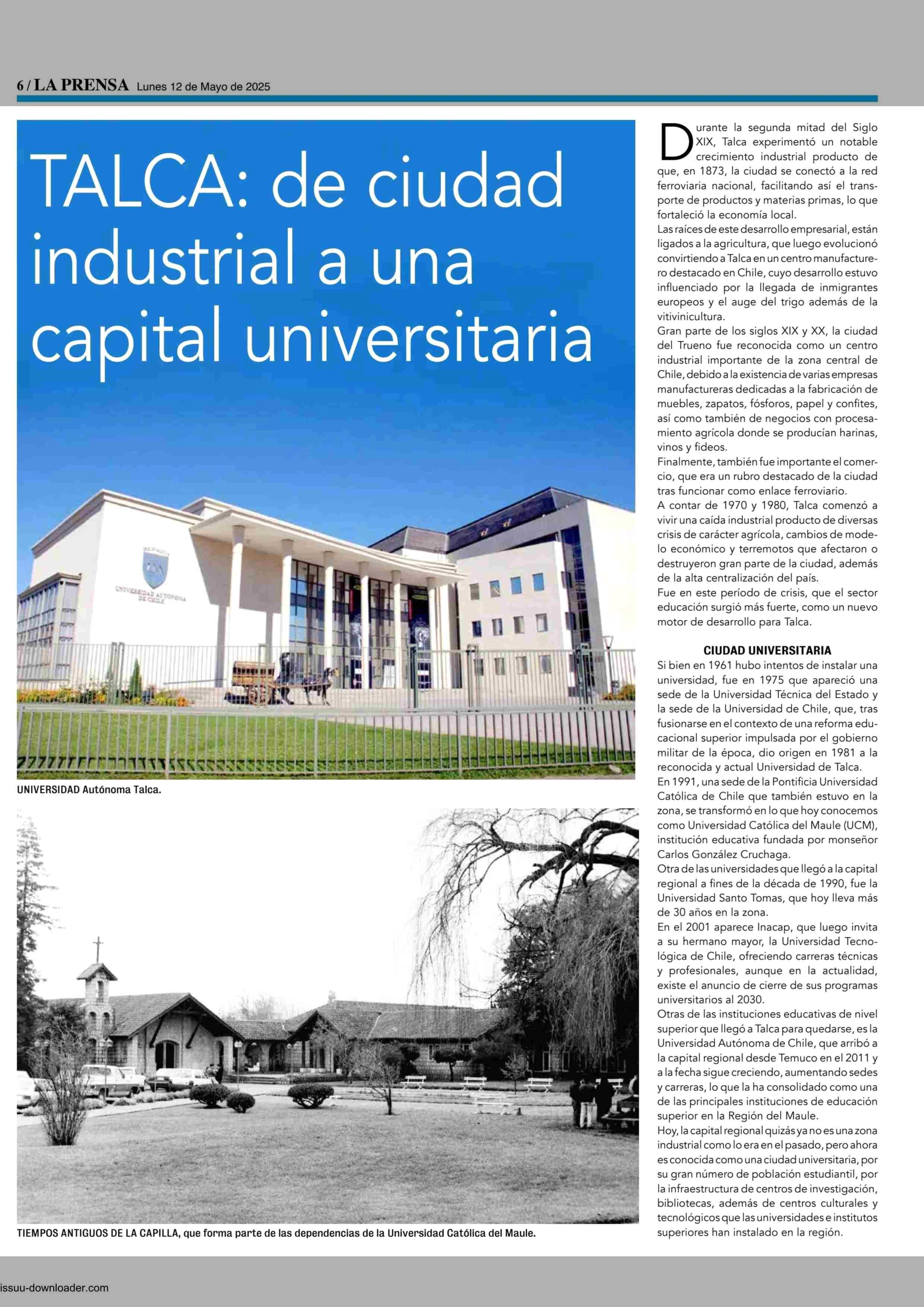 TALCA: de ciudad industrial a una capital universitaria 12-05-2025 La Prensa de Curicó |
