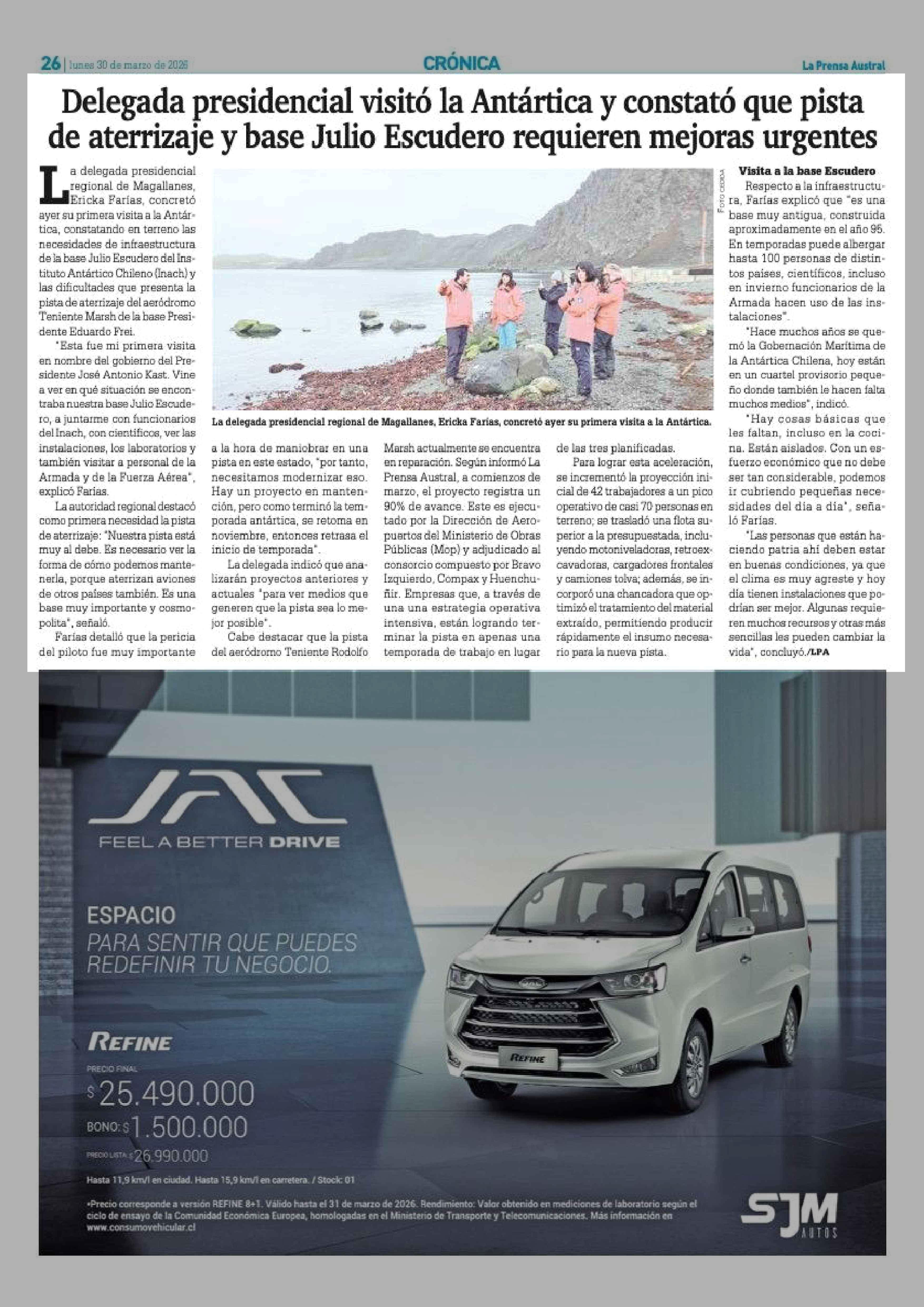 Delegada presidencial visitó la Antártica y constató que pista de aterrizaje y base Julio Escudero requieren mejoras urgentes 30-03-2026 La Prensa Austral |