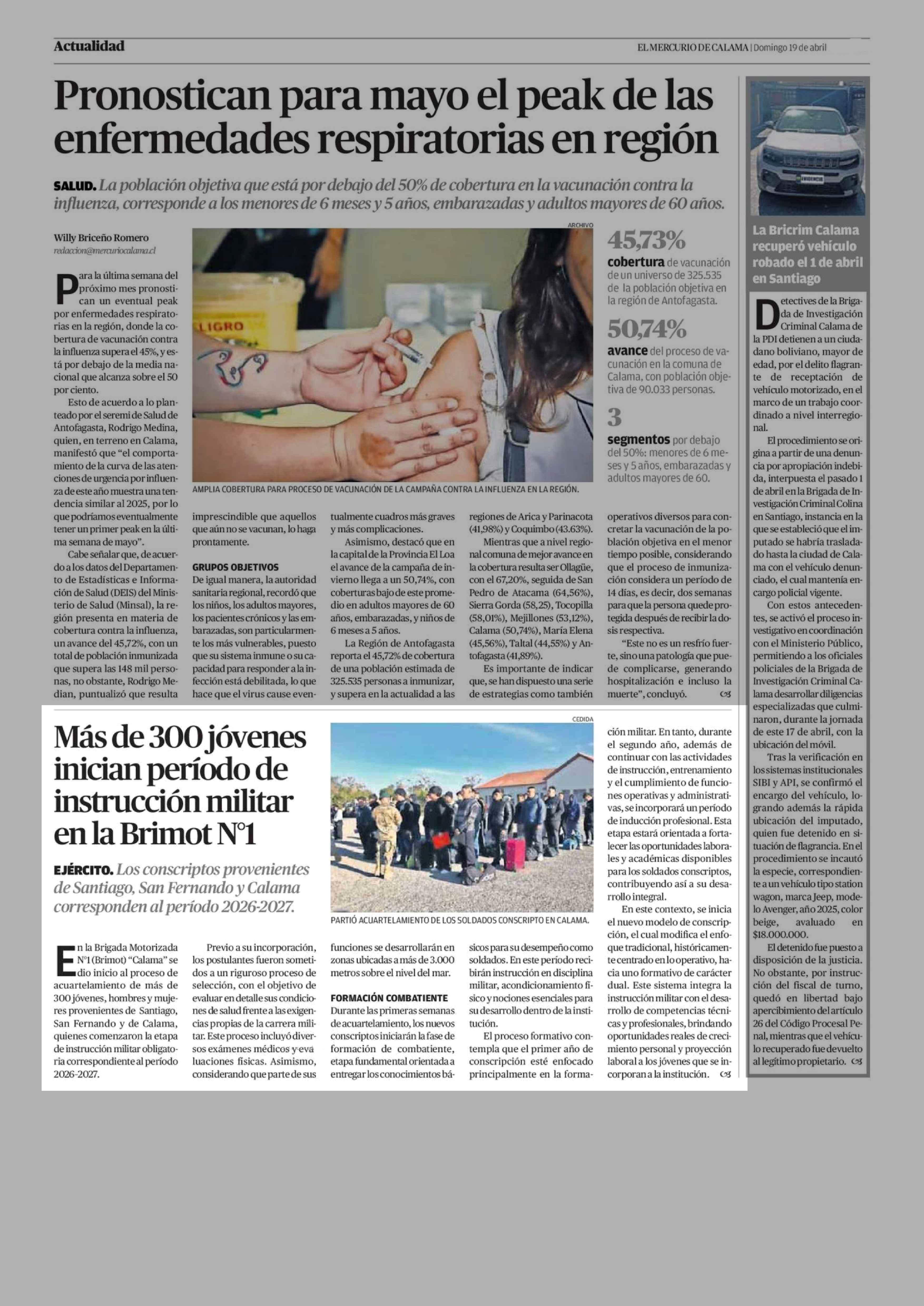 Más de 300 jóvenes inician período de instrucción militar en la Brimot Nº1 19-04-2026 El Mercurio de Calama |