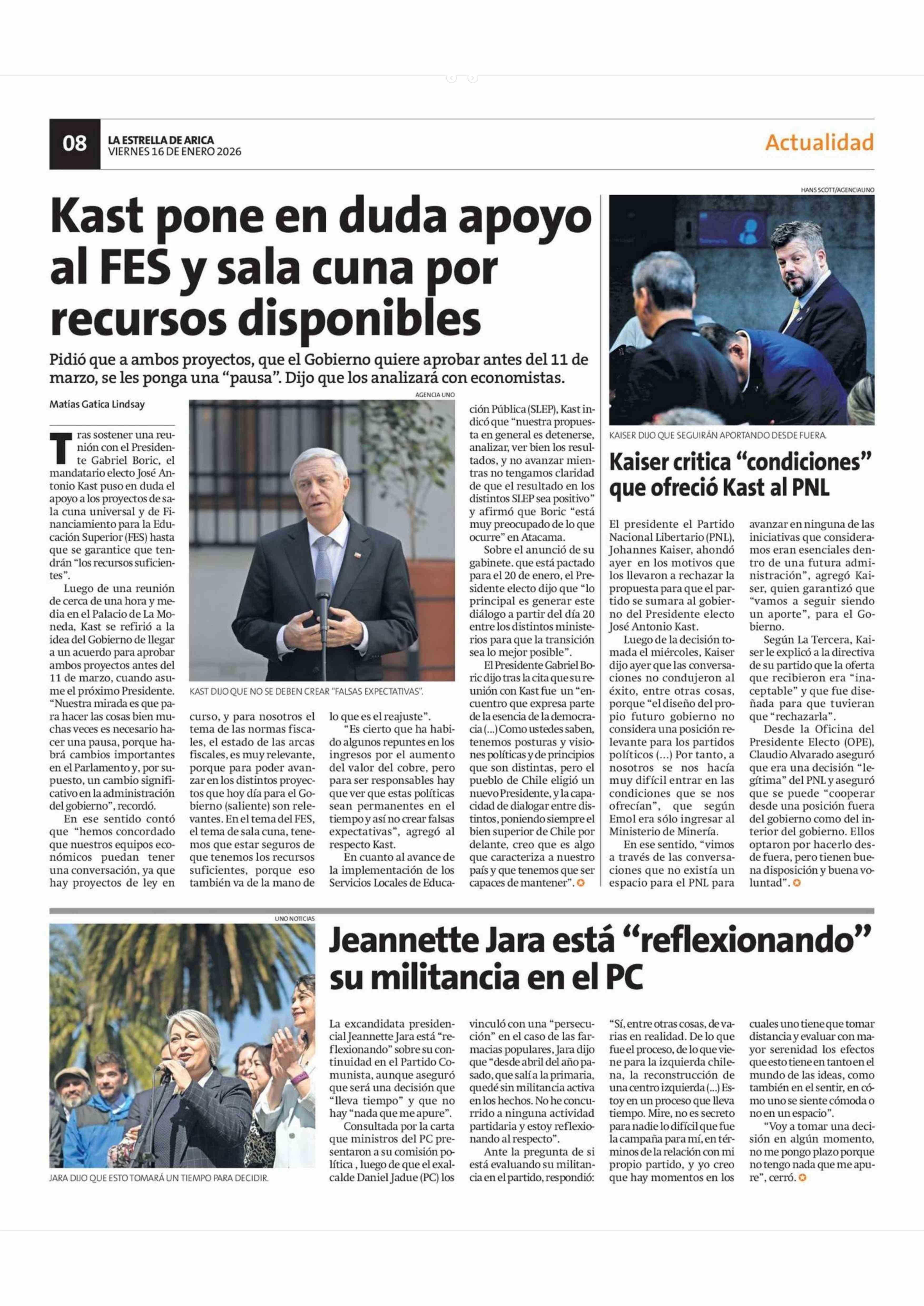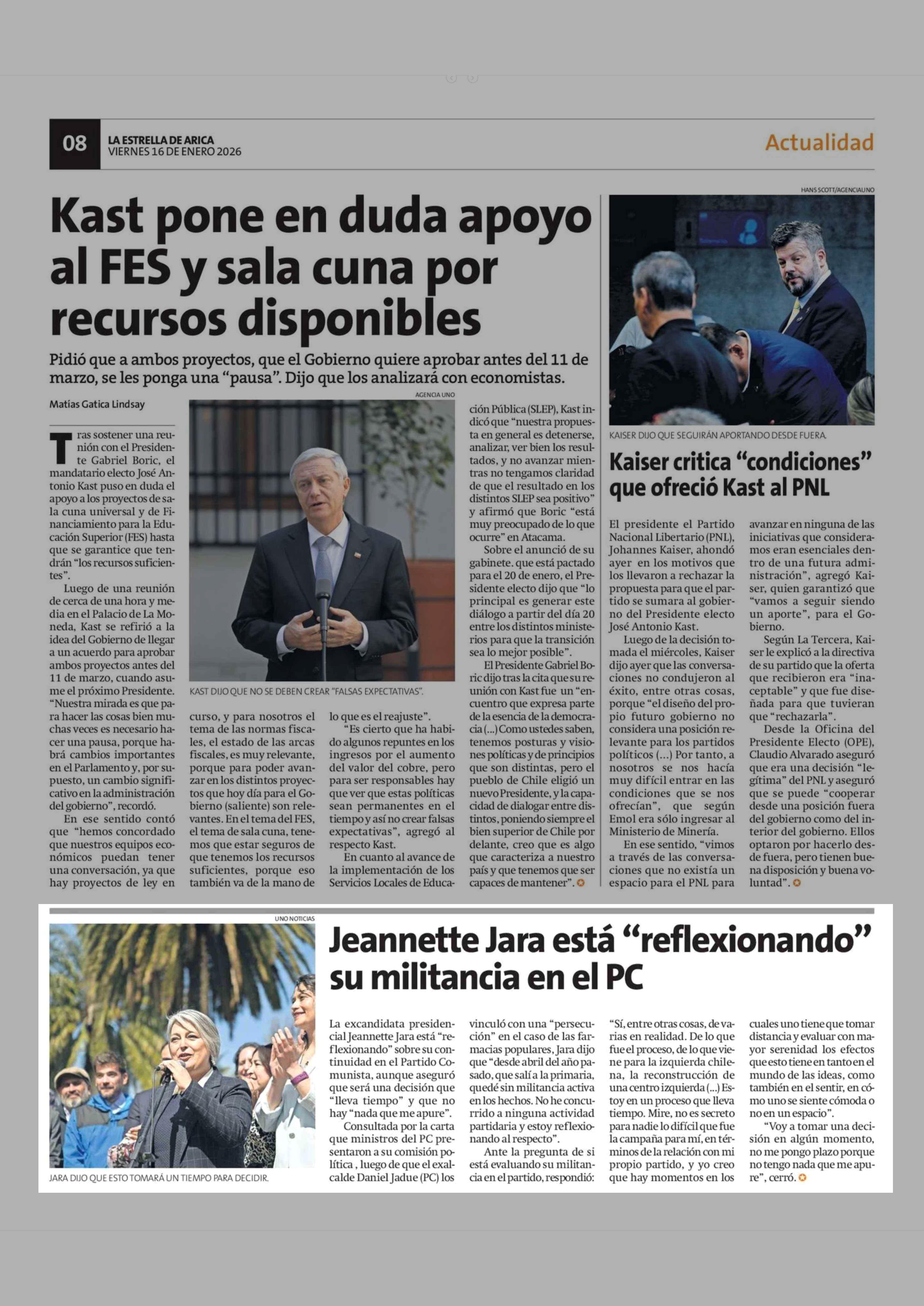 Jeannette Jara está "reflexionando" su militancia en el PC 16-01-2026 La Estrella de Arica |