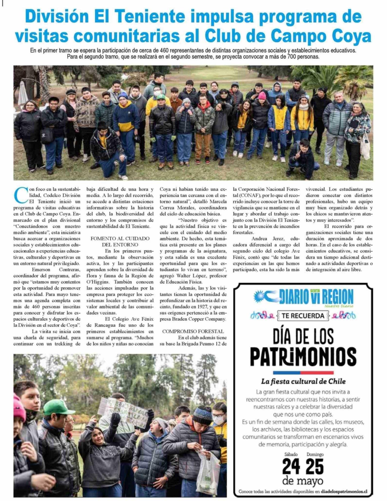 División El Teniente impulsa programa de visitas comunitarias al Club de Campo Coya 15-05-2025 Diario VI Región |