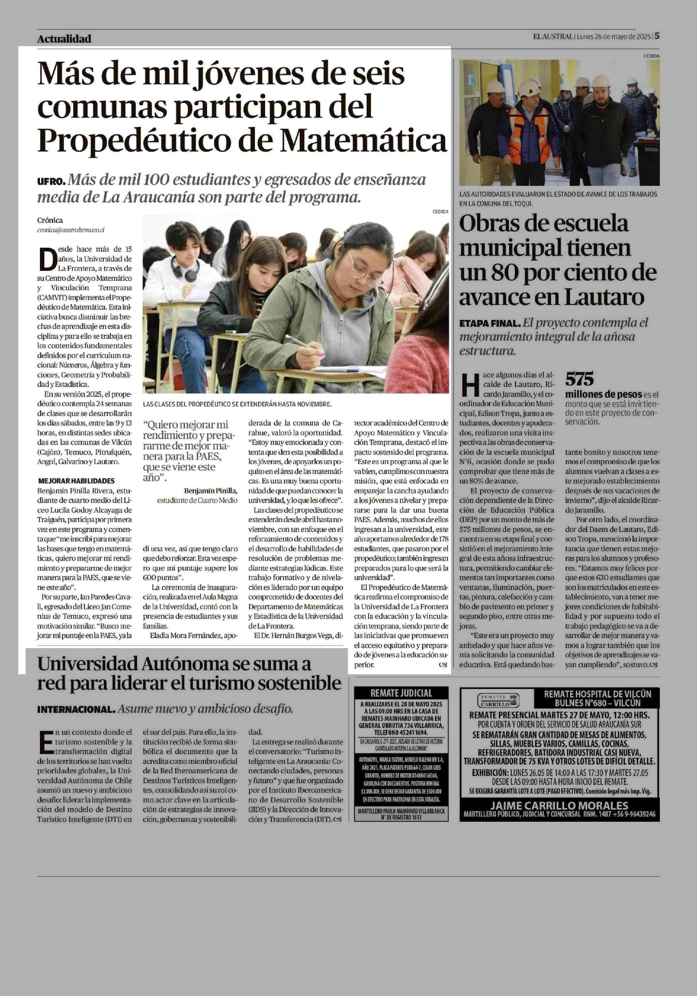 Más de mil jóvenes de seis comunas participan del Propedéutico de Matemática 26-05-2025 El Austral de la Araucanía |