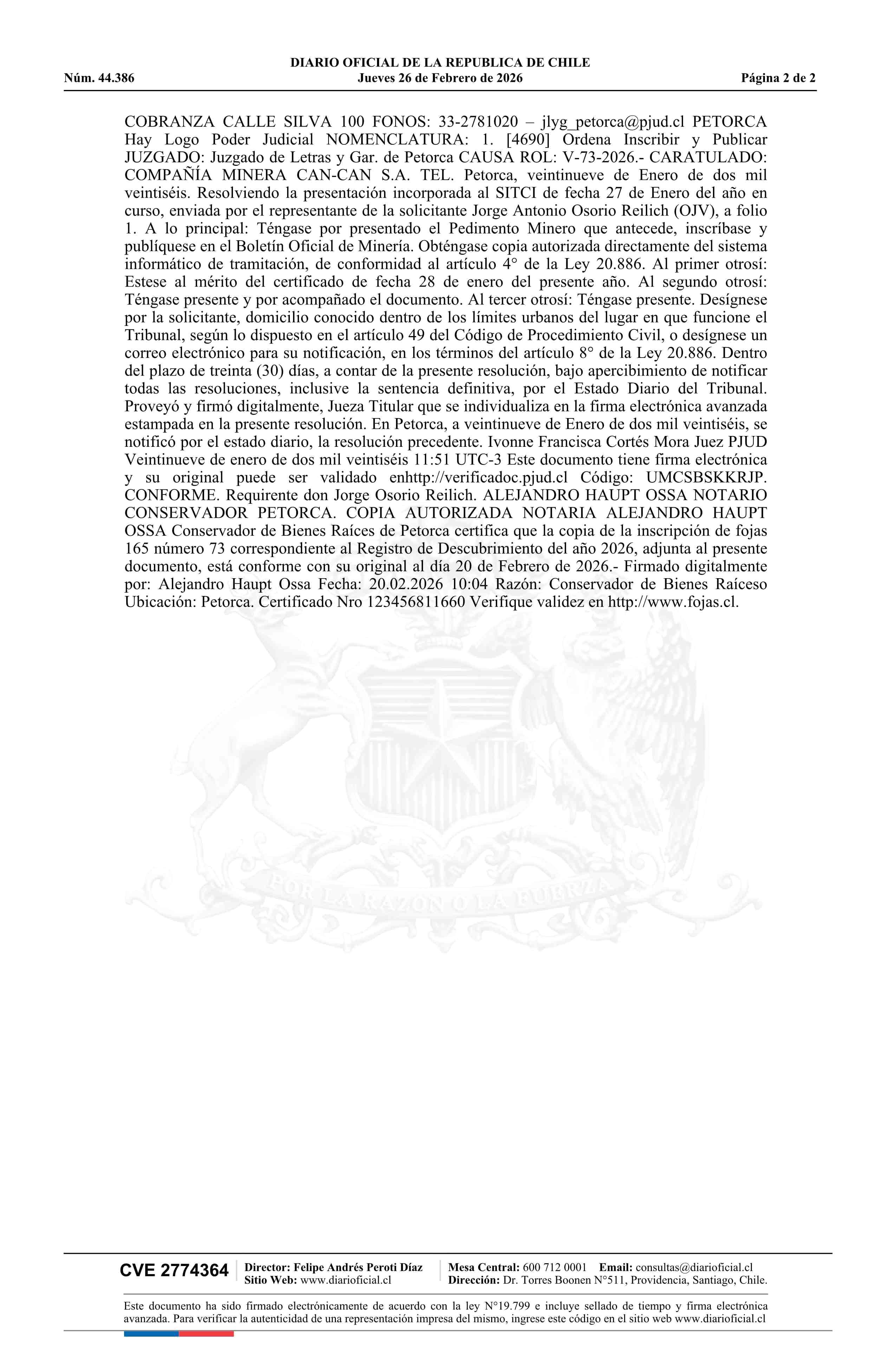 26-02-2026 DIARIO OFICIAL CHILE - BOLETÍN OFICIAL DE MINERÍA
