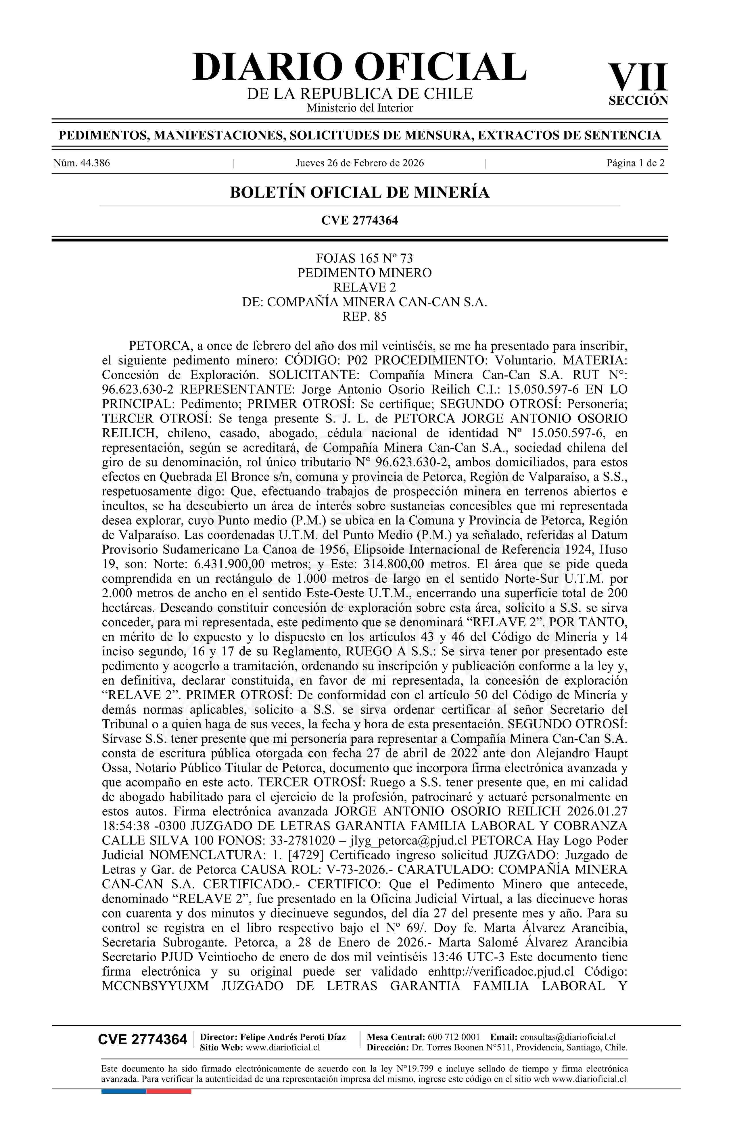 Fuente: DIARIO OFICIAL CHILE - BOLETÍN OFICIAL DE MINERÍA (DIARIO OFICIAL CHILE – BOM – PEDIMENTOS MINEROS) Página(s): 71-72