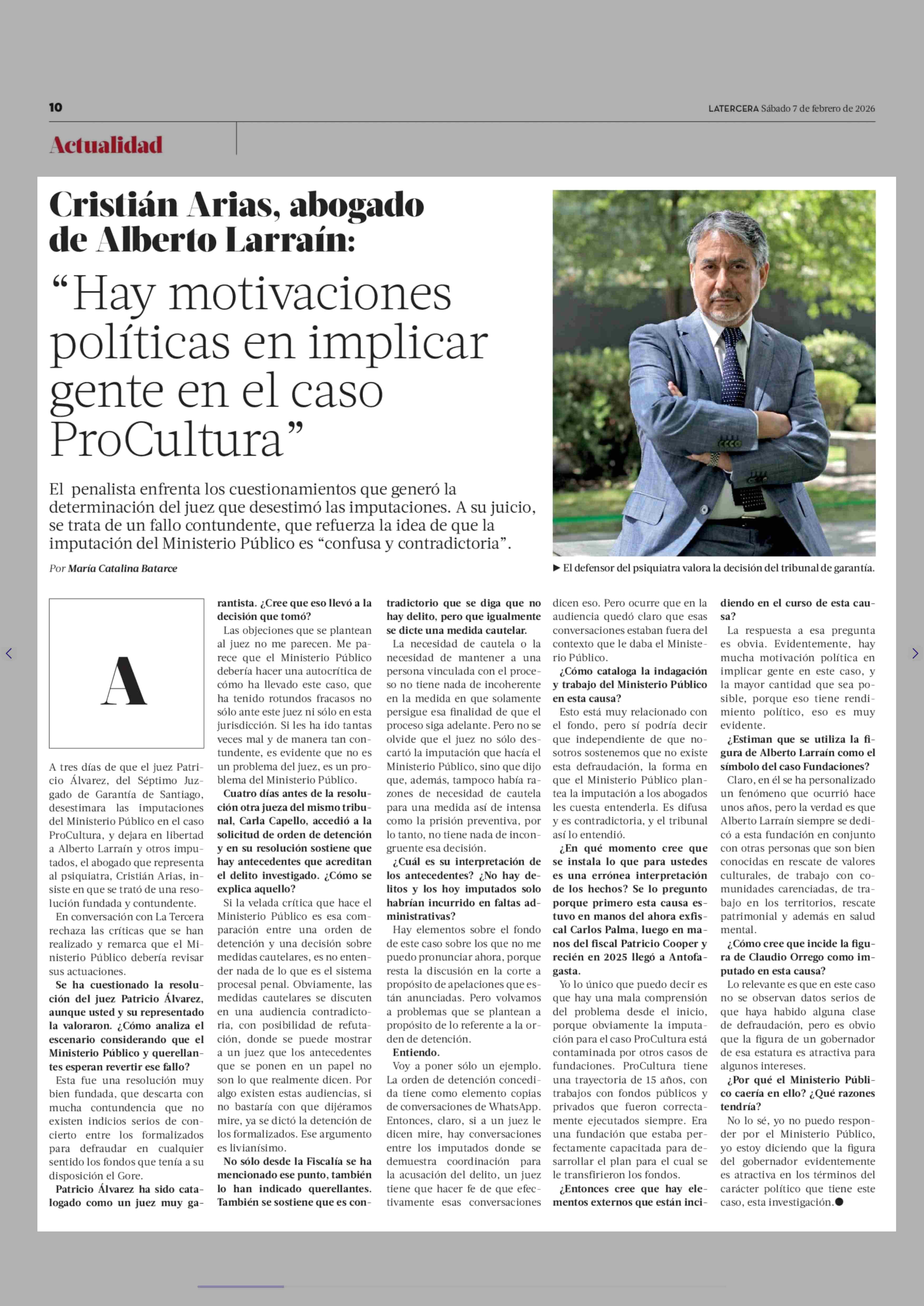 "Hay motivaciones políticas en implicar gente en el caso ProCultura" 07-02-2026 La Tercera |