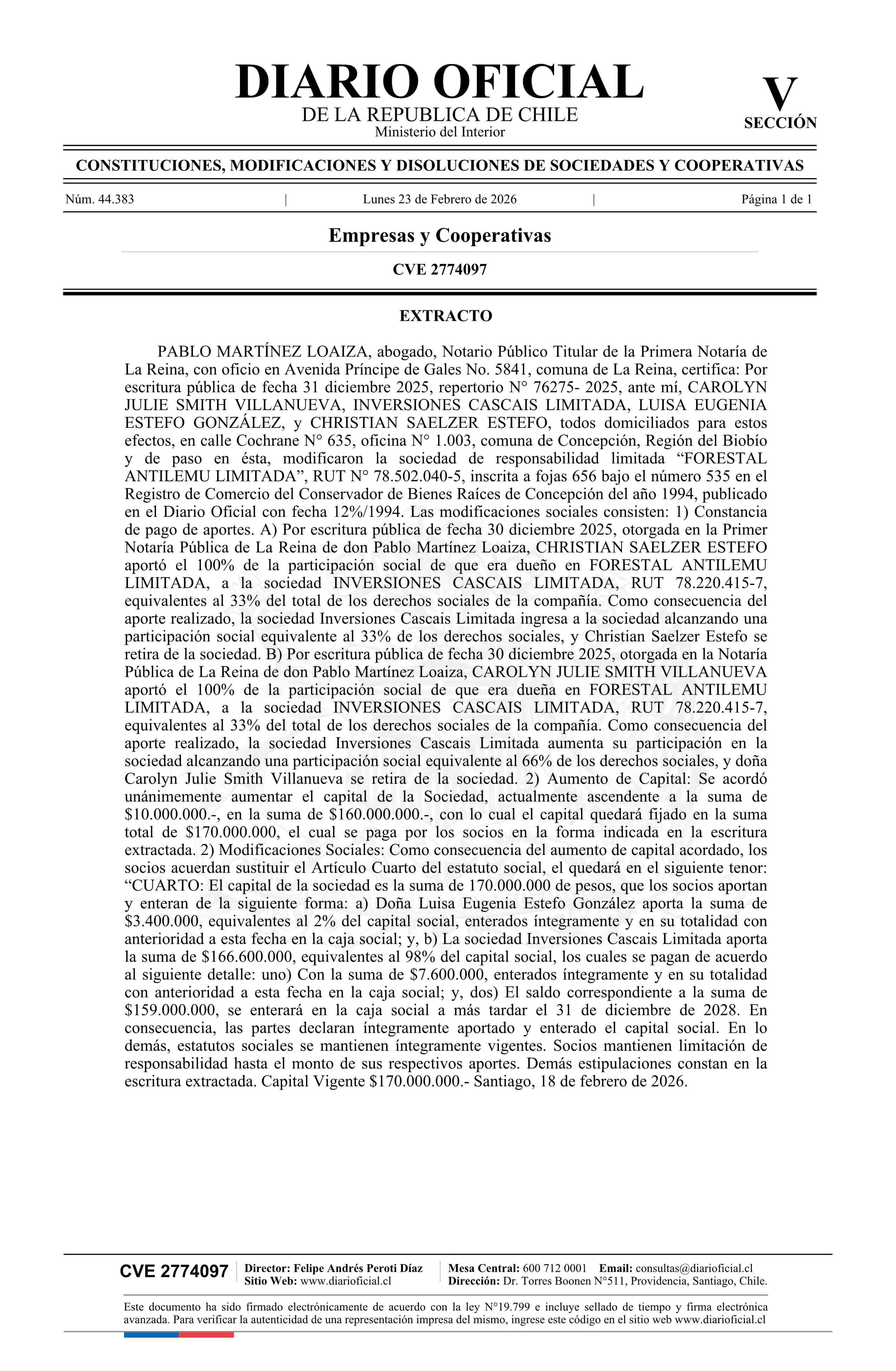 FORESTAL ANTILEMU LIMITADA 78.502.040-5 23-02-2026 Diario Oficial Edición Electrónica |