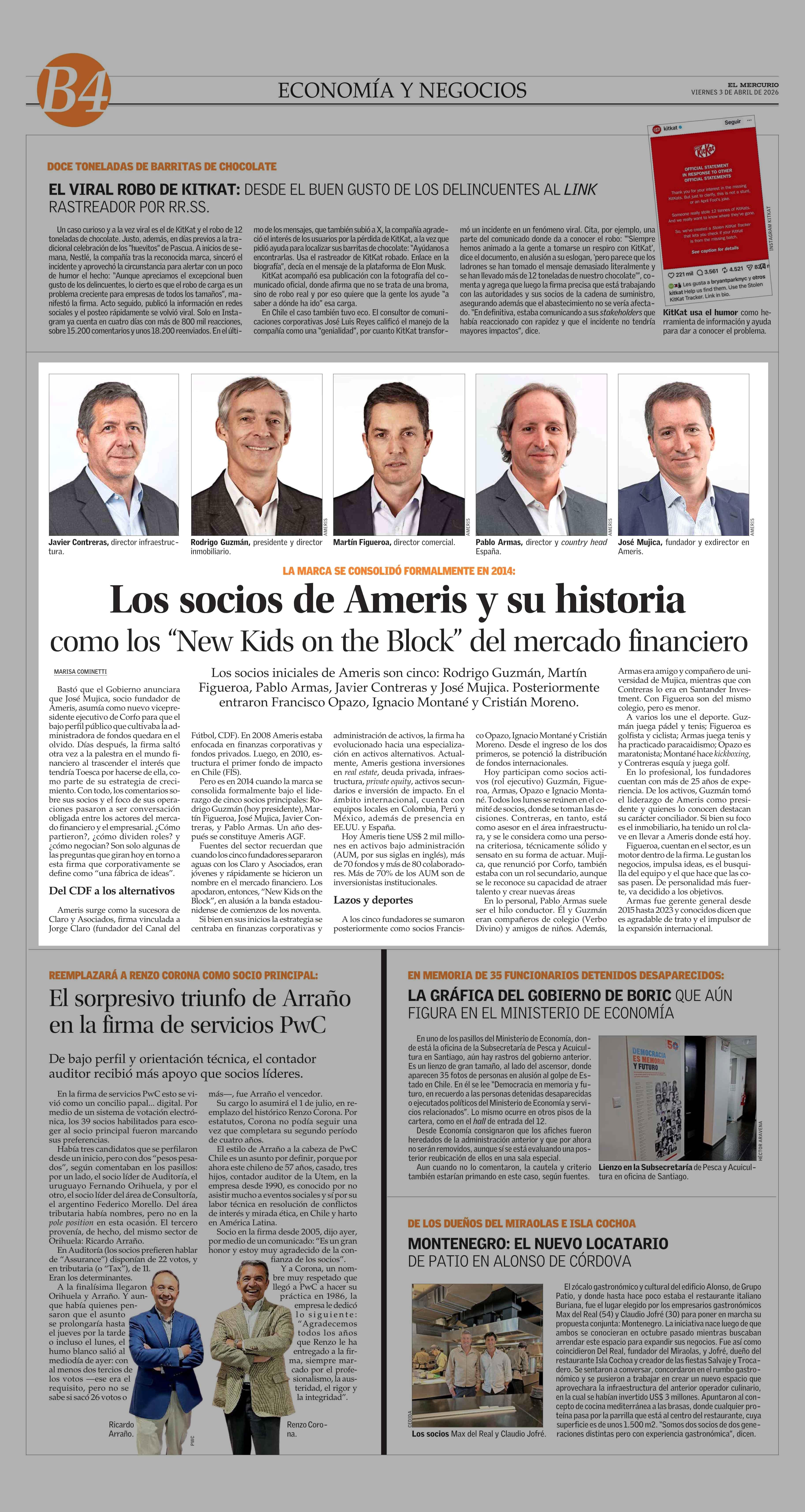 Los socios de Ameris y su historia como los “New Kids on the Block” del mercado financiero 03-04-2026 El Mercurio |
