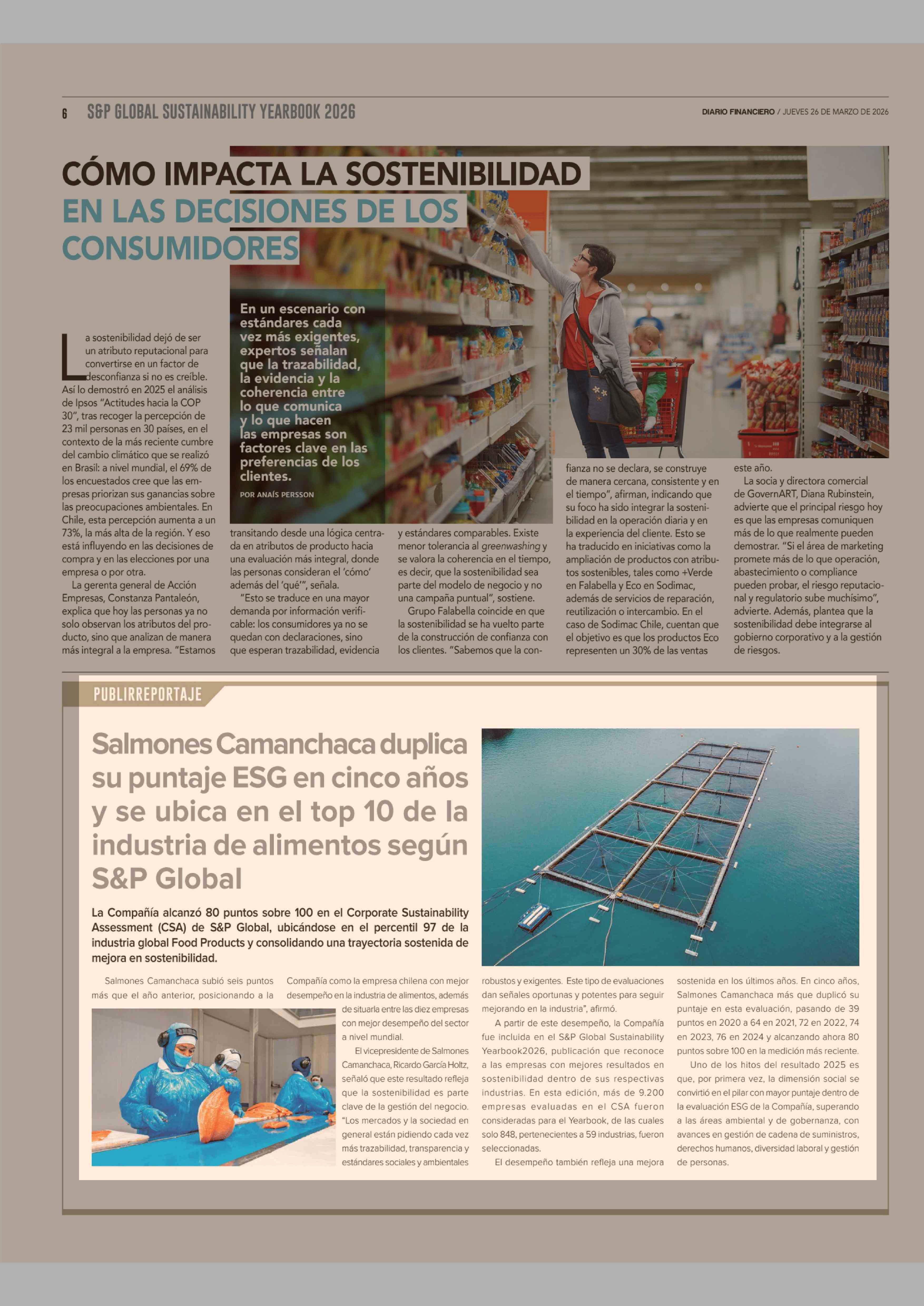 Título: Salmones Camanchaca duplica su puntaje ESG en cinco años y se ubica en el top 10 de la industria de alimentos según S&P Global