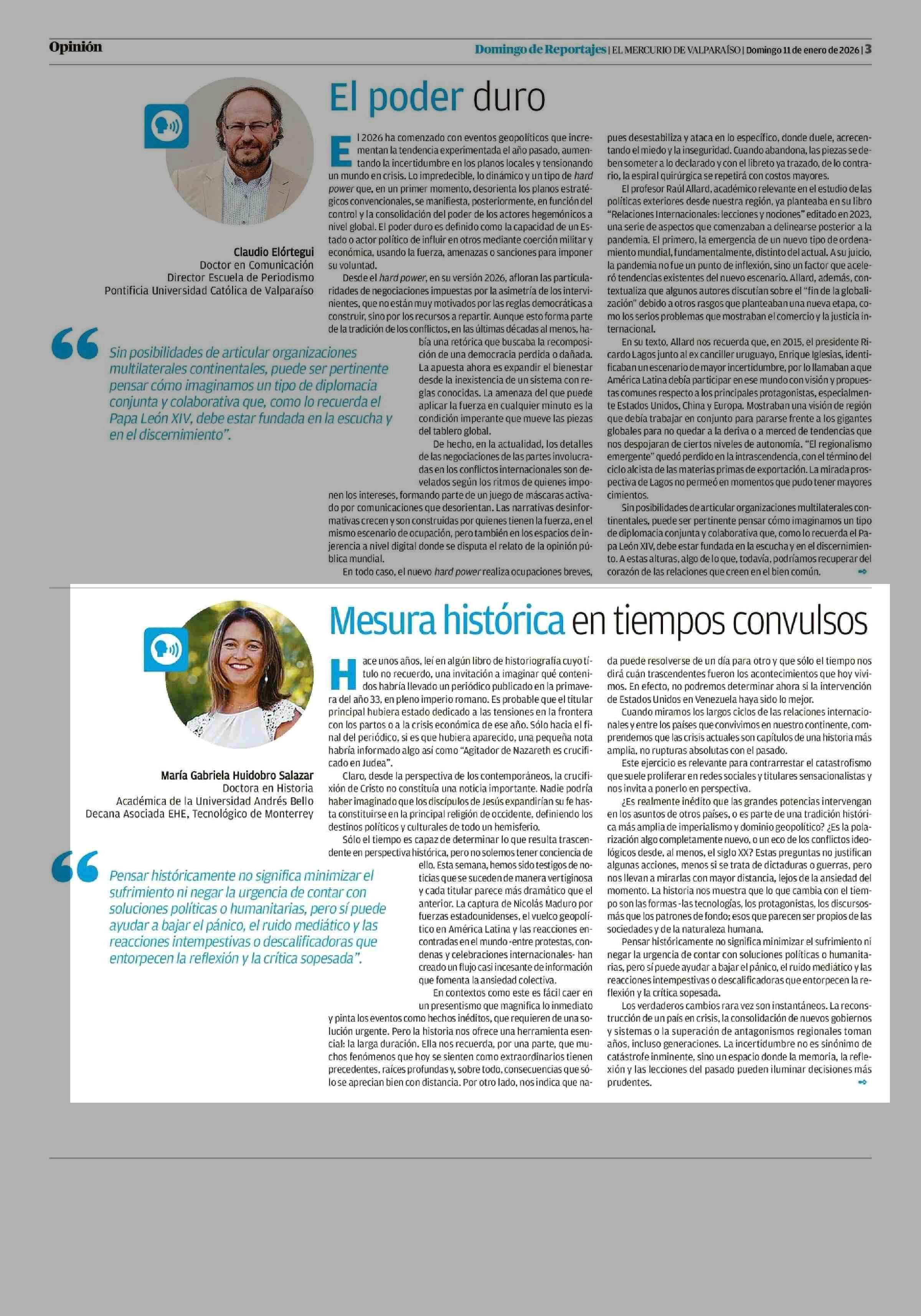 Columnas de Opinión: Mesura histórica en tiempos convulsos 11-01-2026 El Mercurio de Valparaíso |