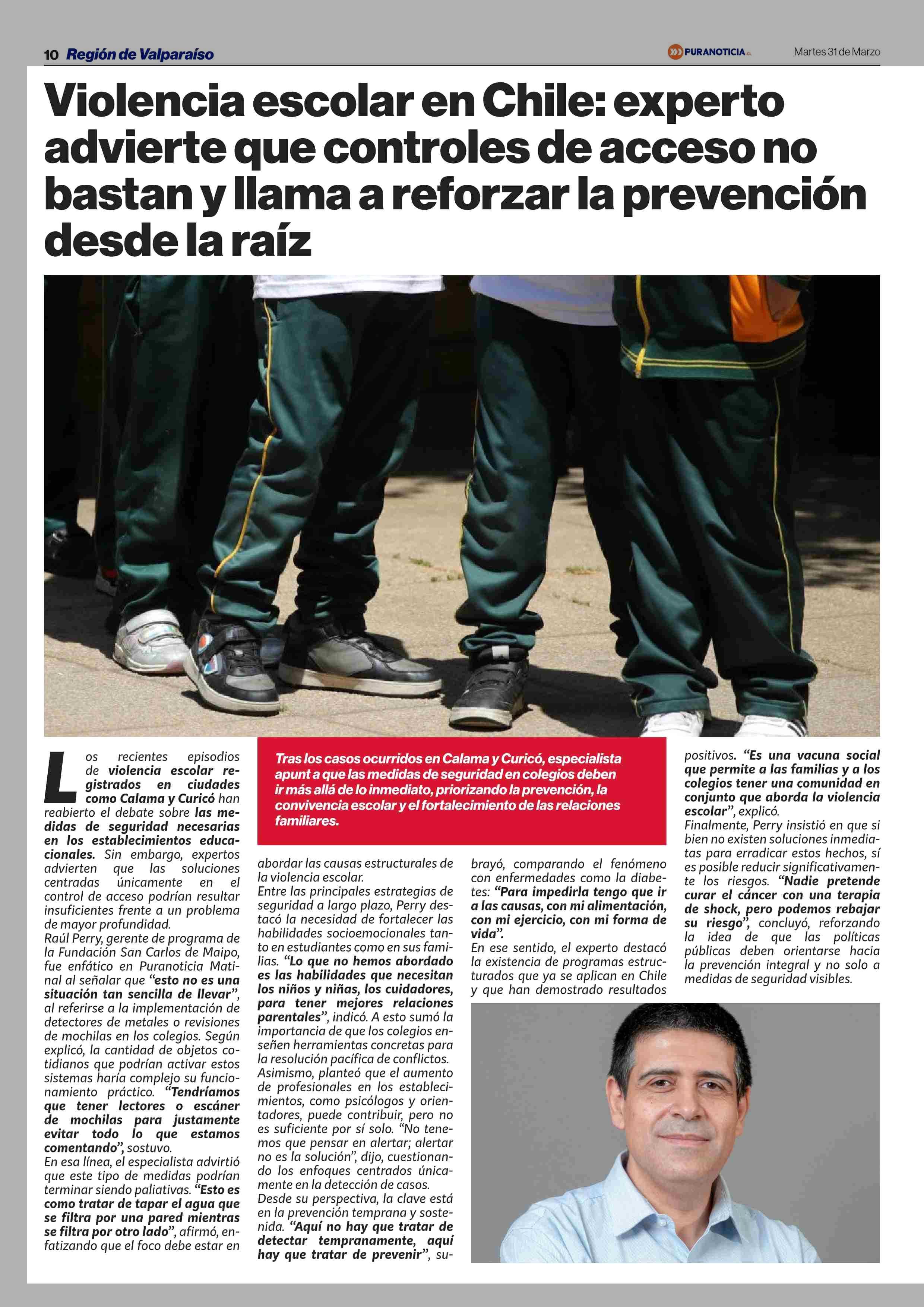 Violencia escolar en Chile: experto advierte que controles de acceso no bastan y llama a reforzar la prevención desde la raíz 31-03-2026 Puranoticia.cl |