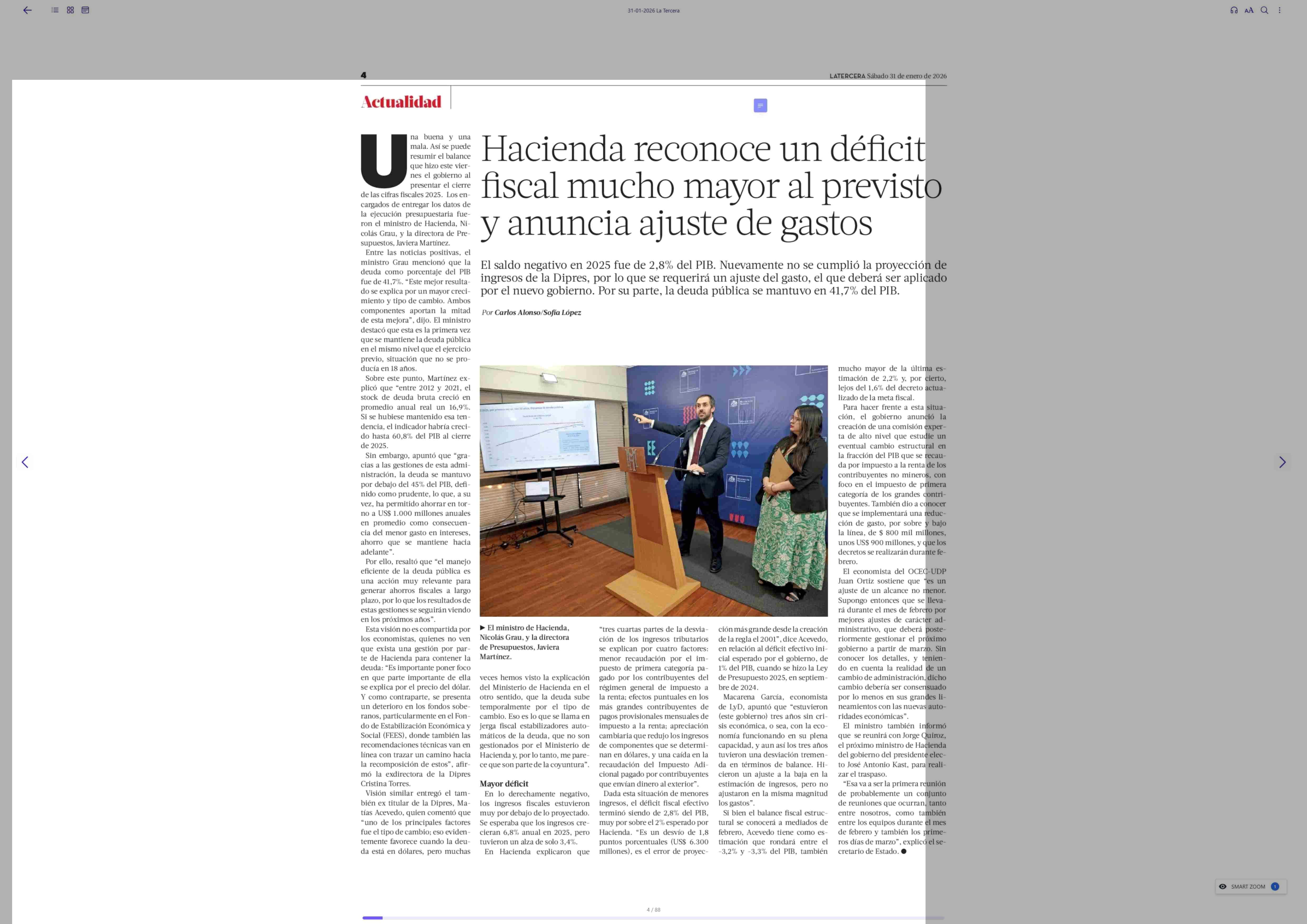 Hacienda reconoce un déficit “fiscal mucho mayor al previsto “Vanuncia ajuste de gastos 31-01-2026 La Tercera |