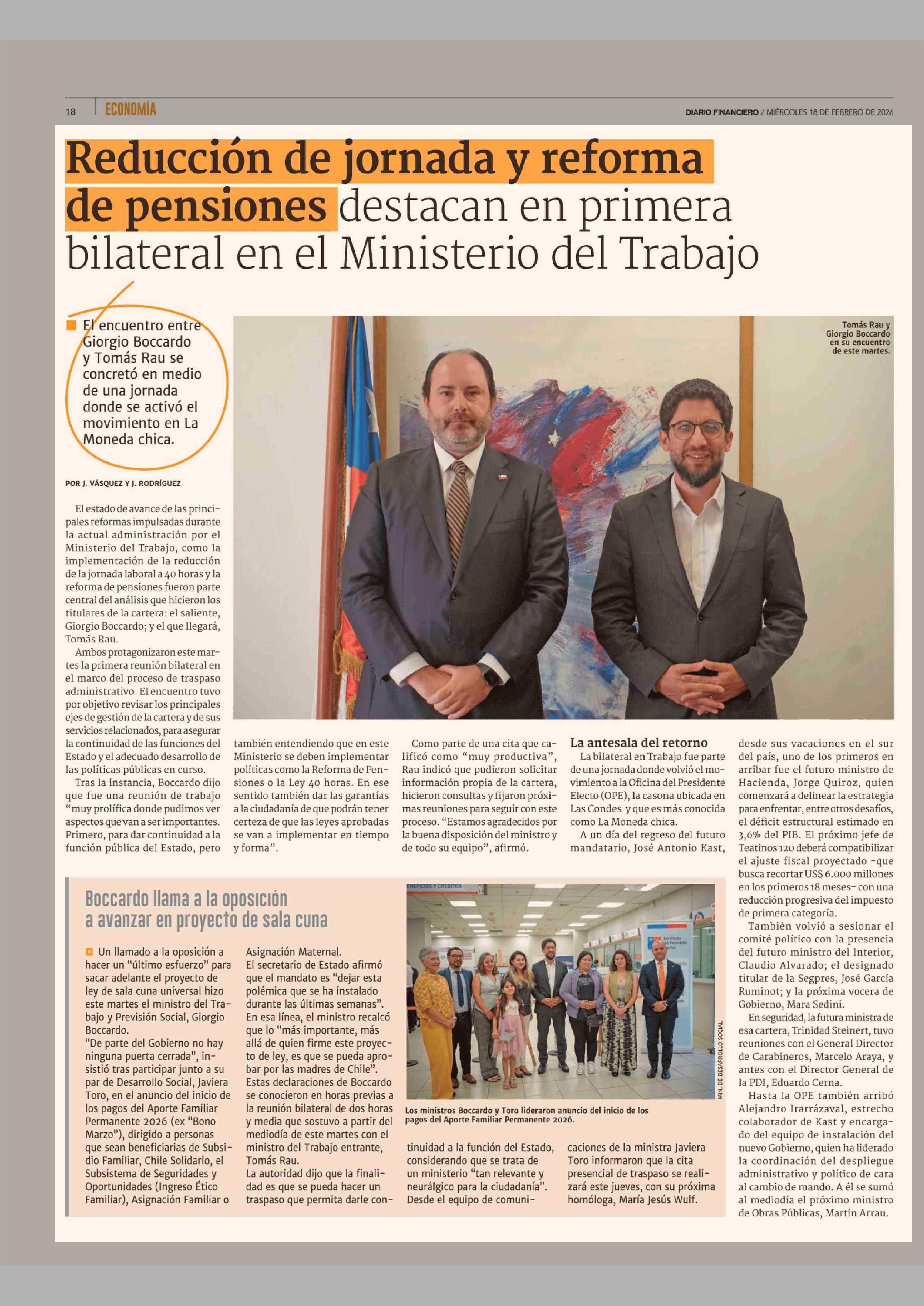 Reducción de jornada y reforma de pensiones destacan en primera bilateral en el Ministerio del Trabajo 18-02-2026 Diario Financiero |